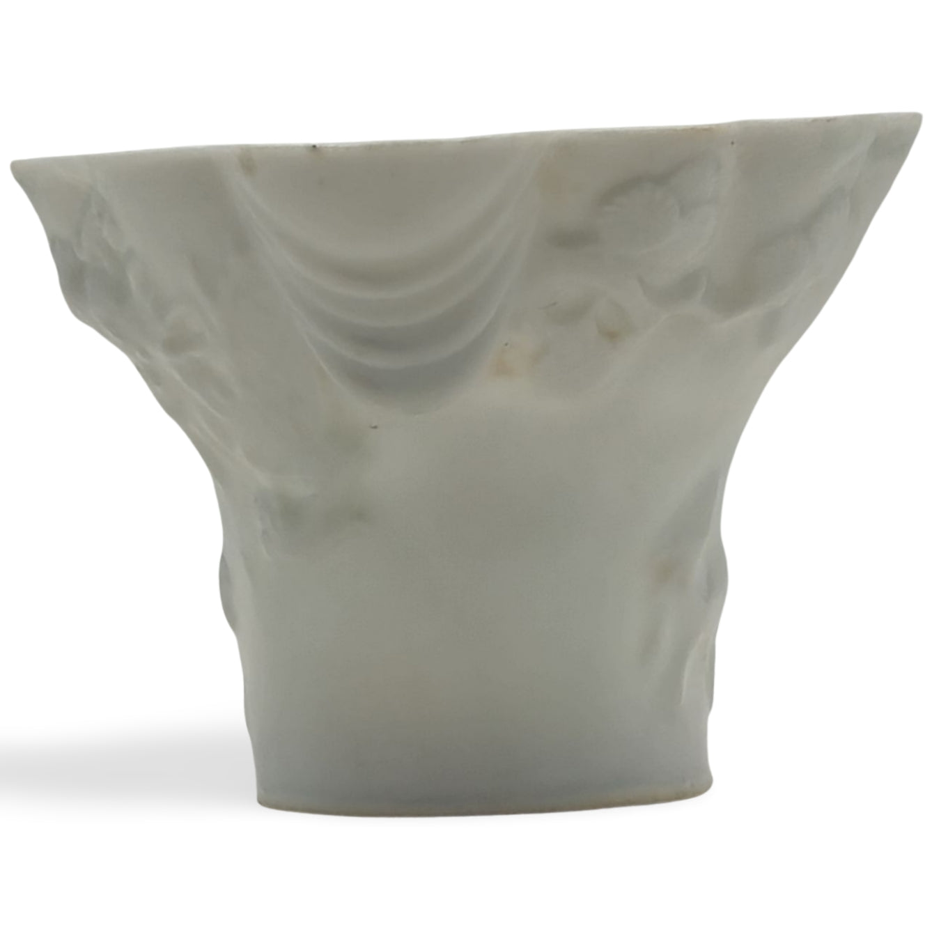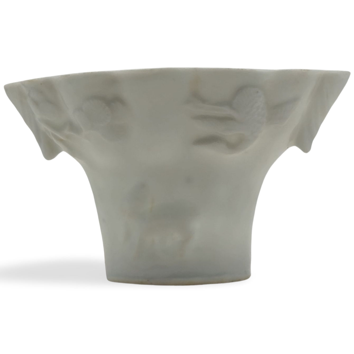 Rhinocerous-horn form cup in white porcelain, with moulded relied of deer, dragon & crane.