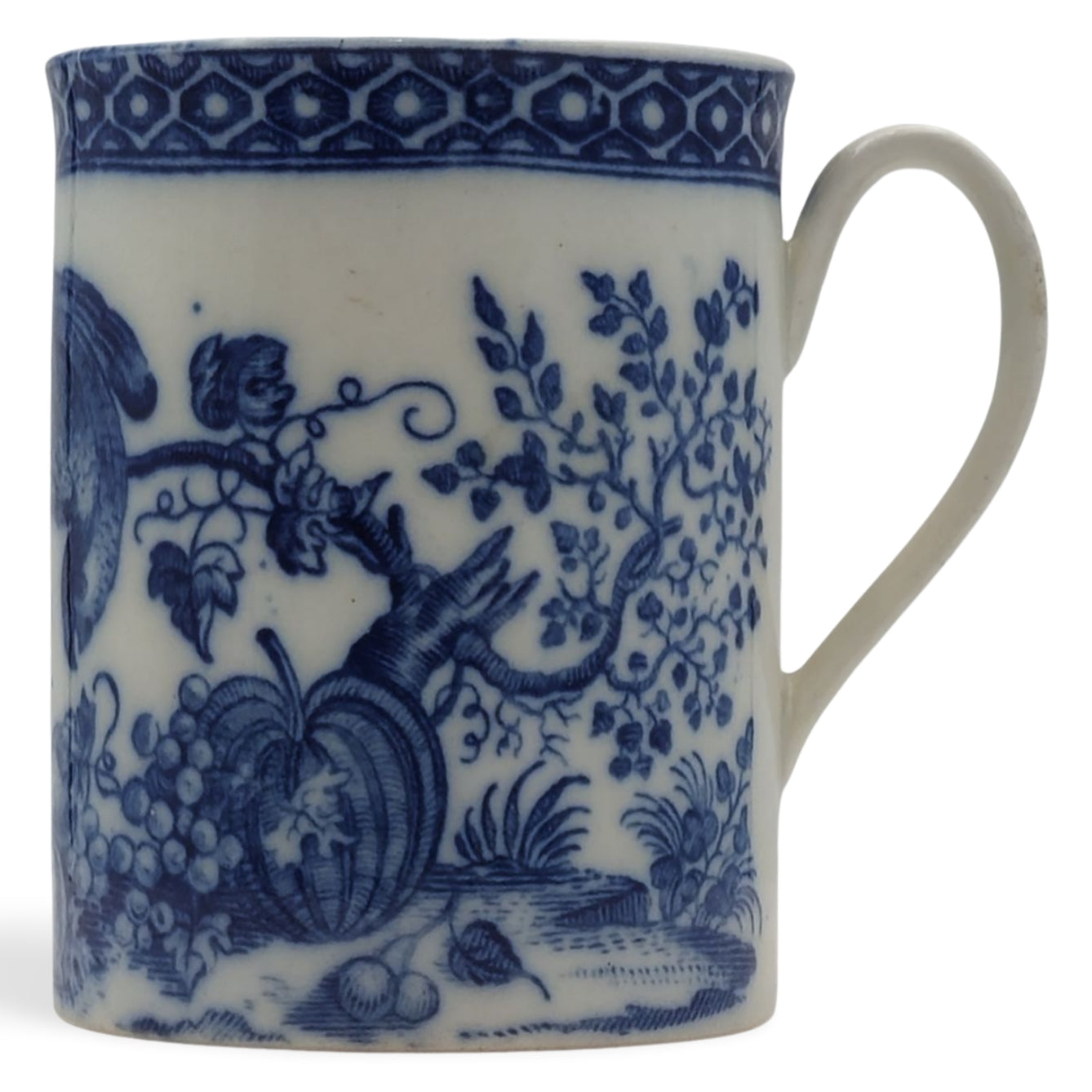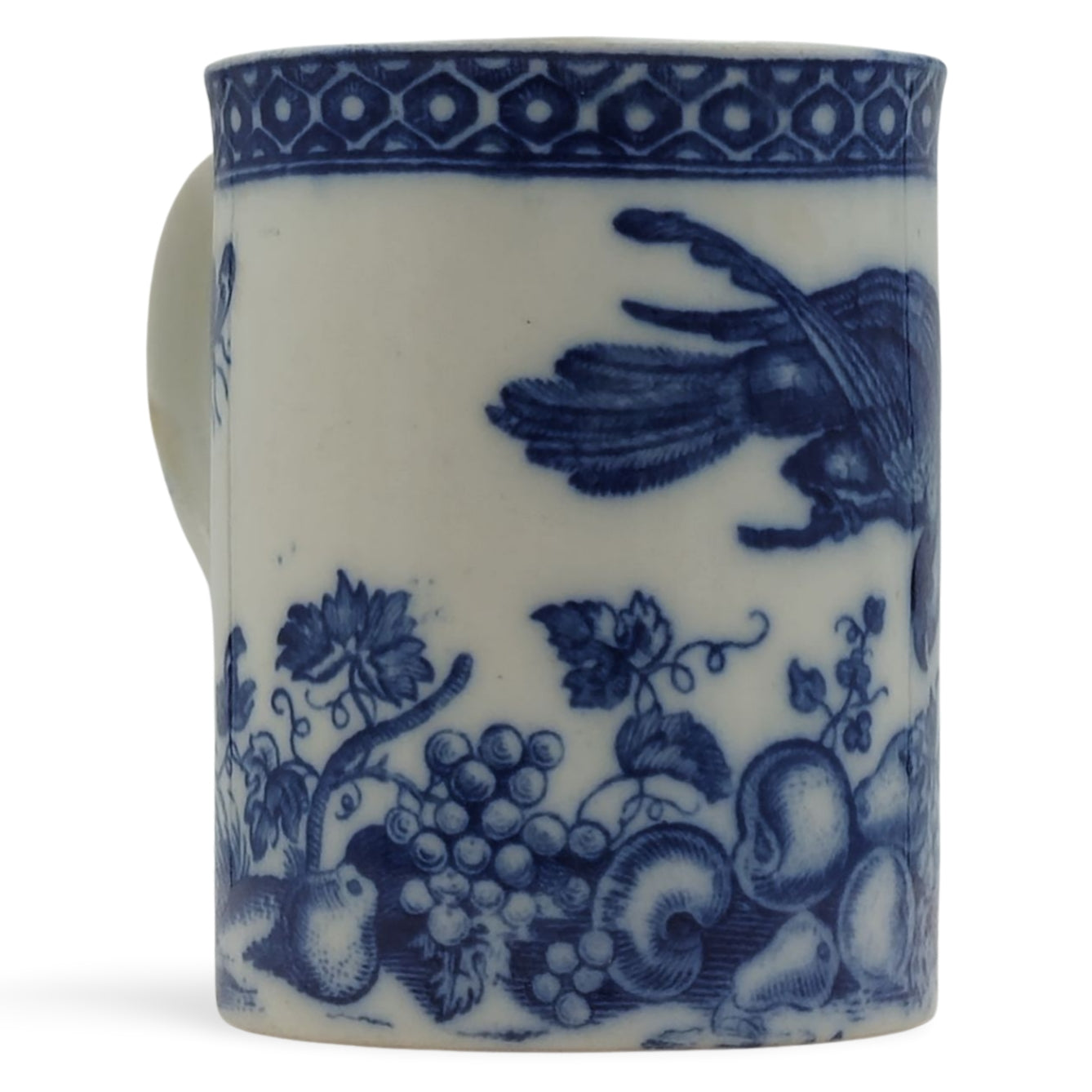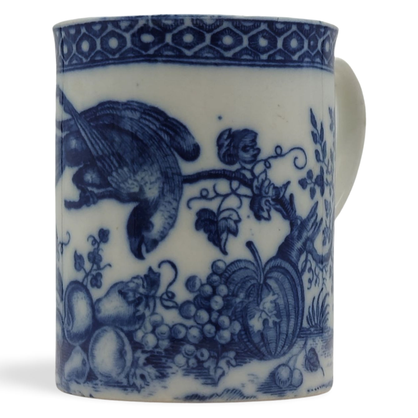 Mug, decorated with the Parrot Pecking Fruit pattern, with a cell border.