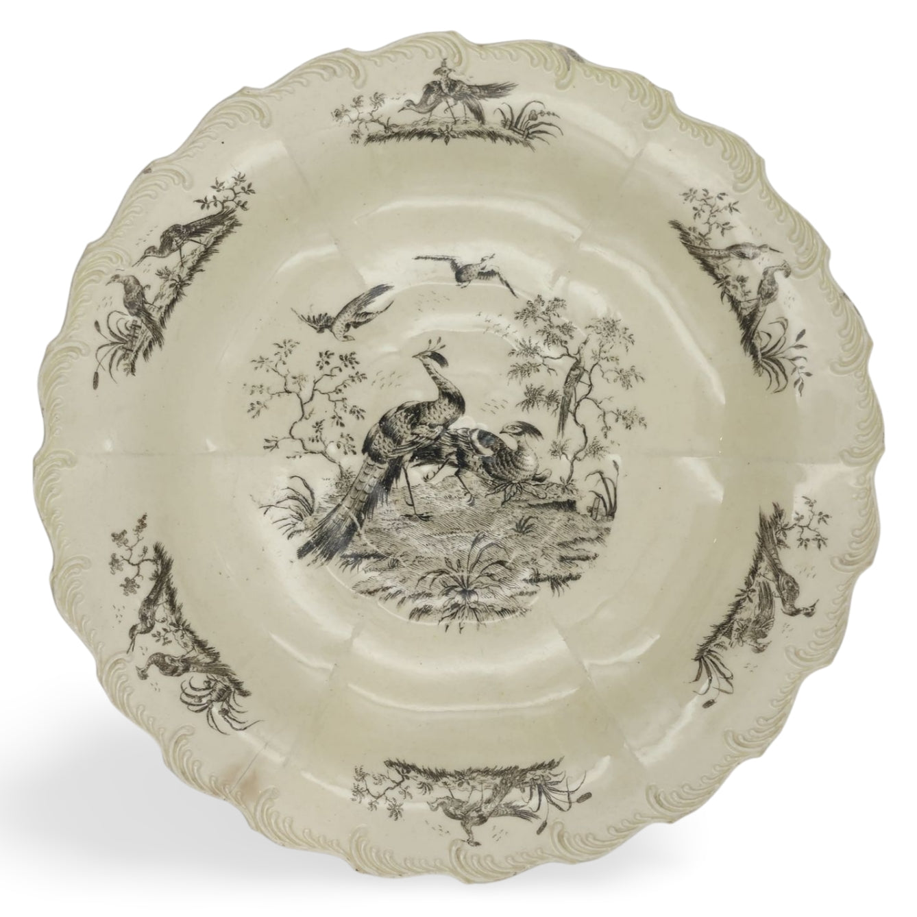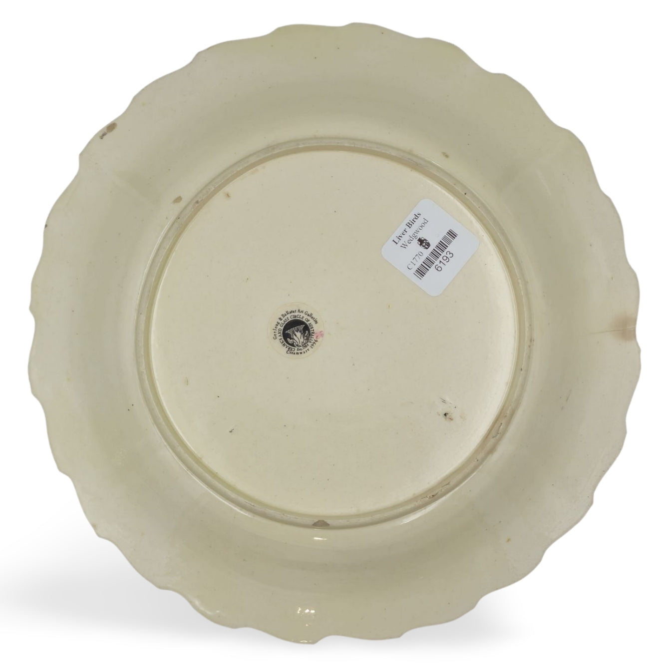 Feather-edged plate with rose molding, decorated with transfer-printed Liver birds.