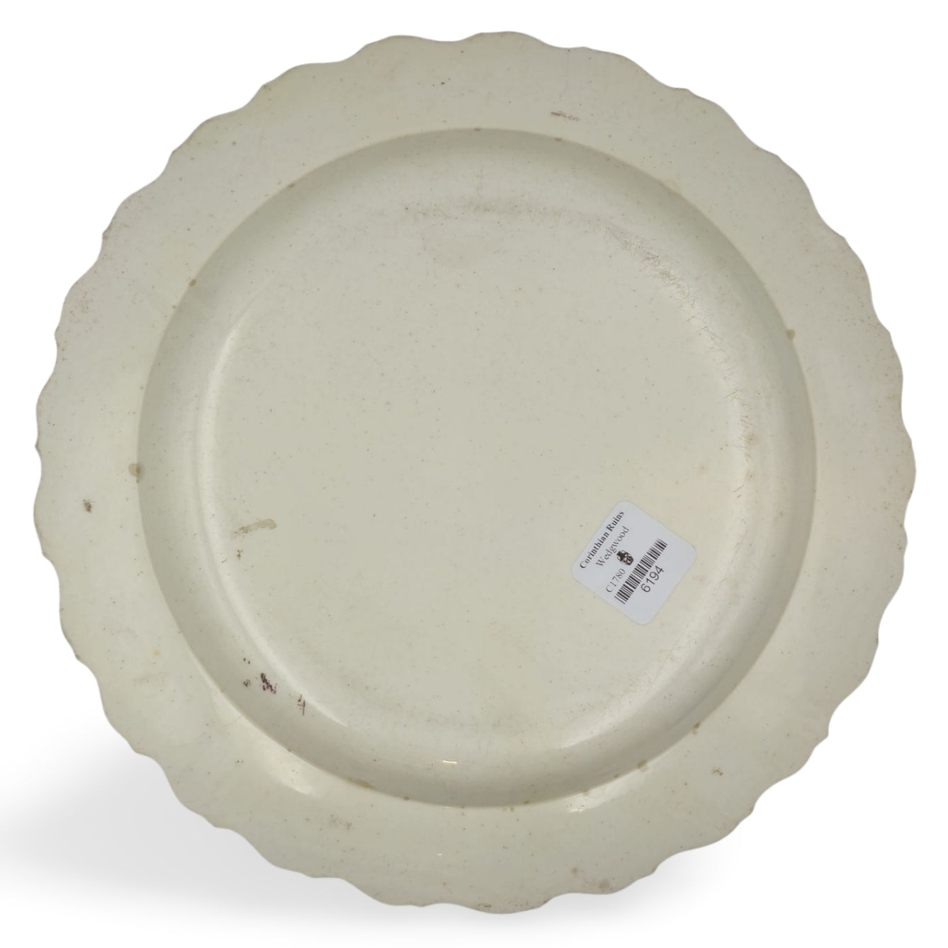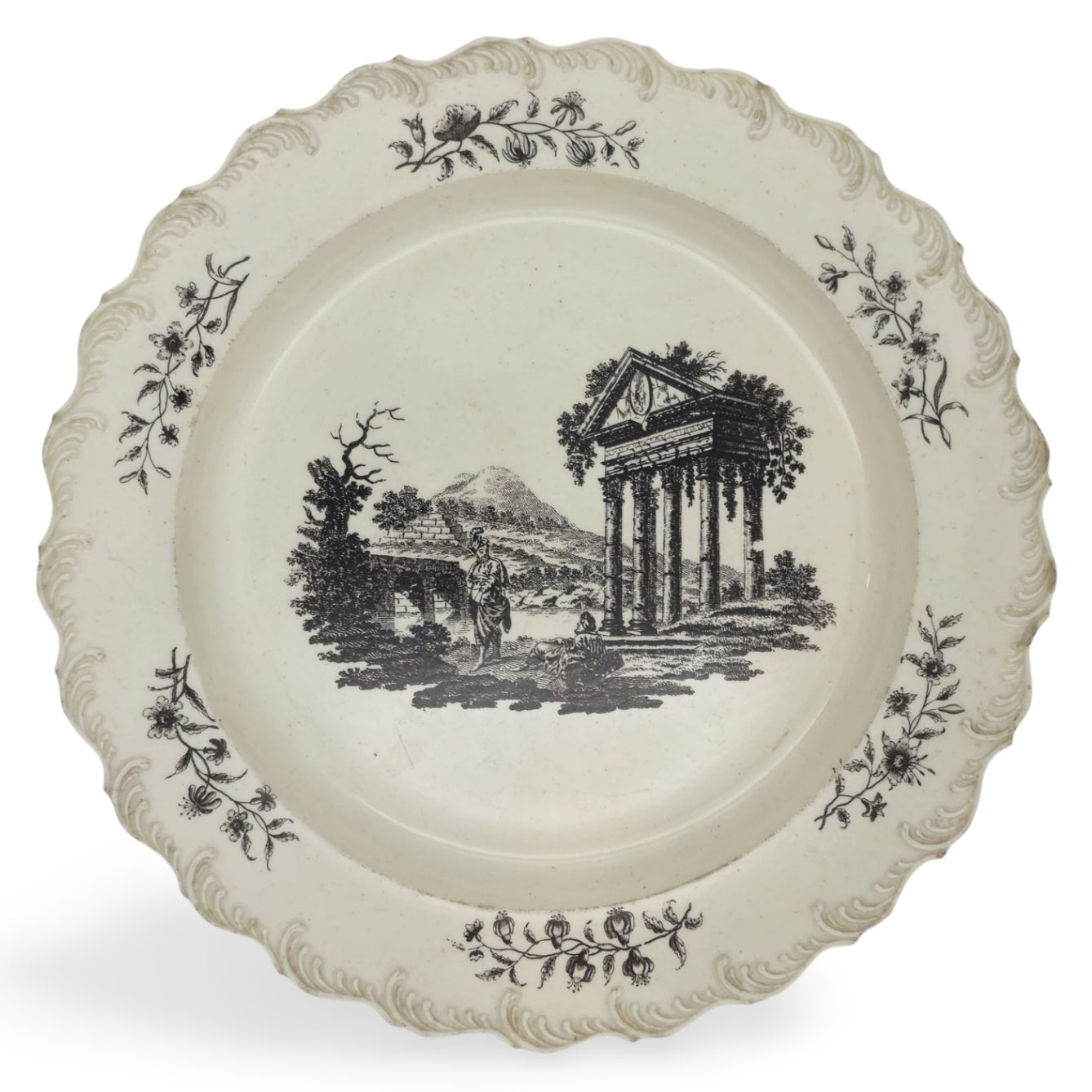 A feather-edged creamware plate, decorated with a transfer-print of Corinthian Ruins.