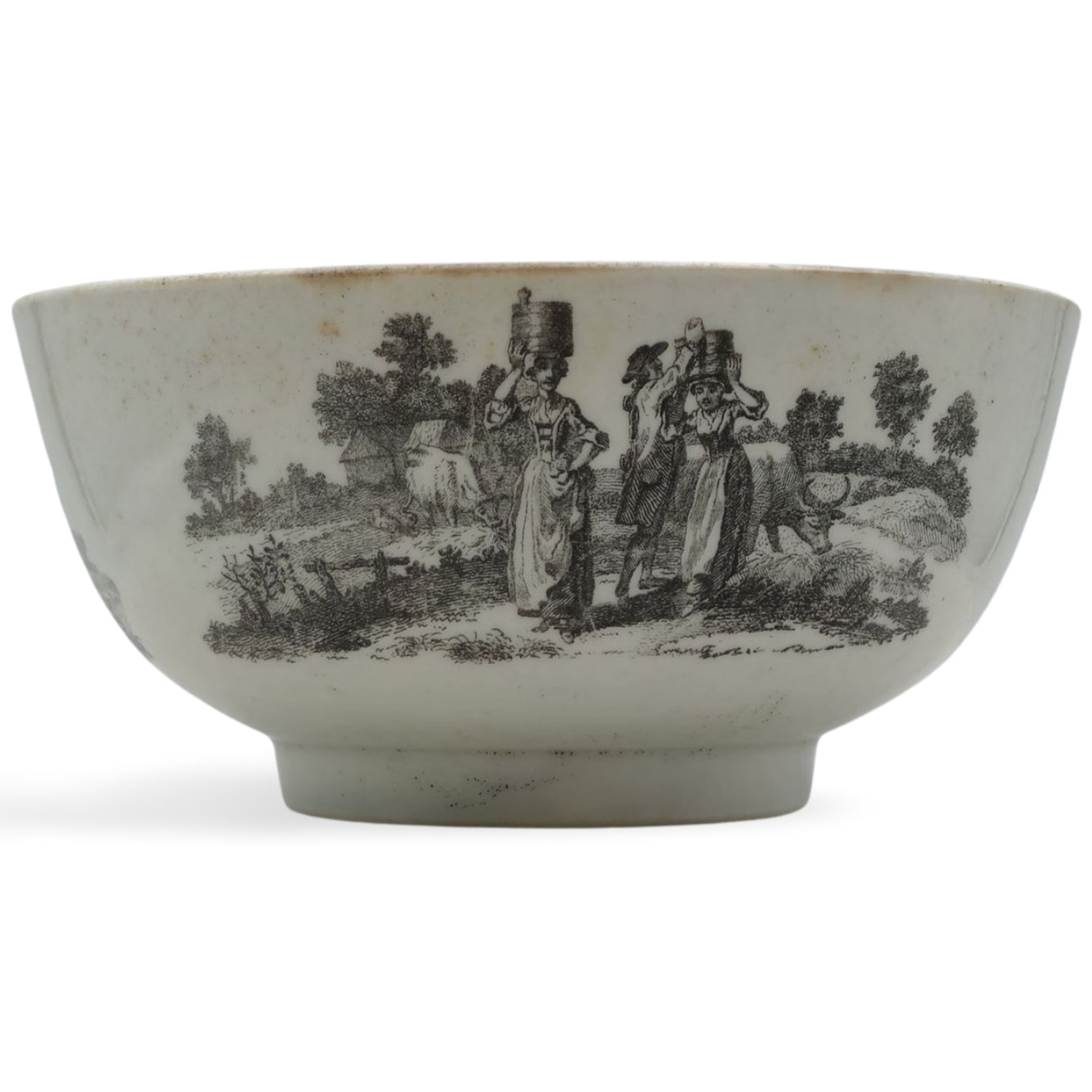 Waste bowl with transfer-printed decoration of The Milkmaids and two pastoral scenes.