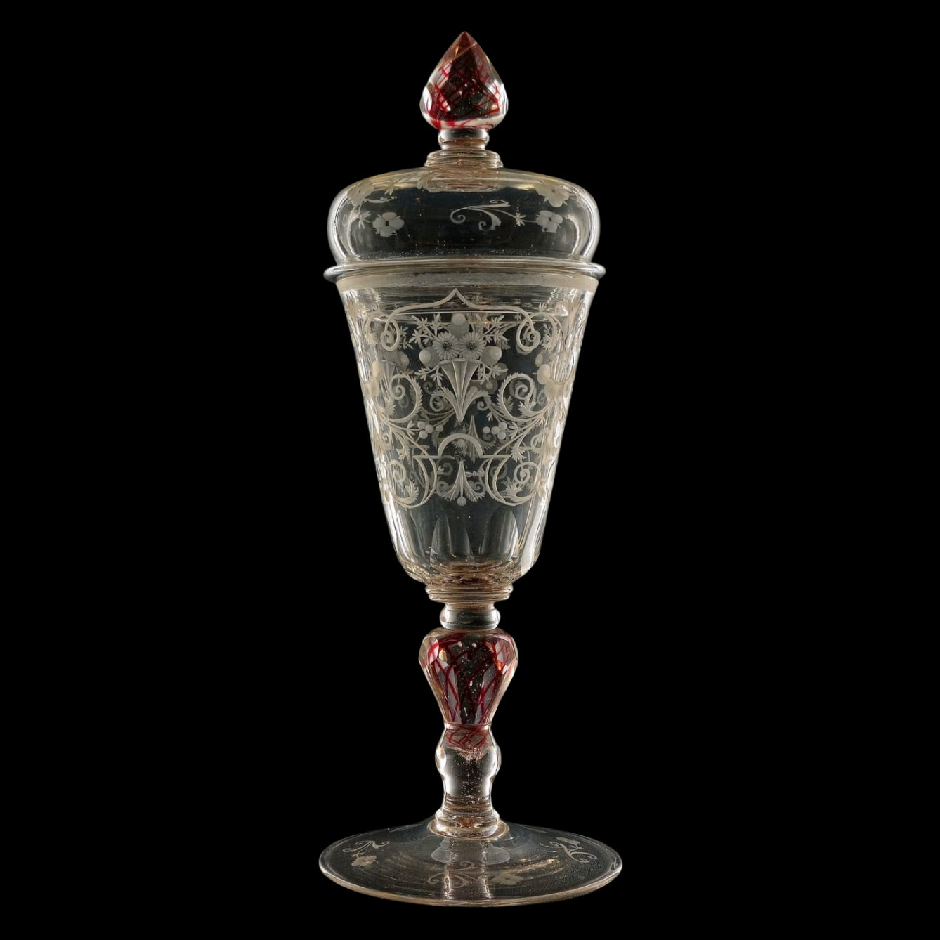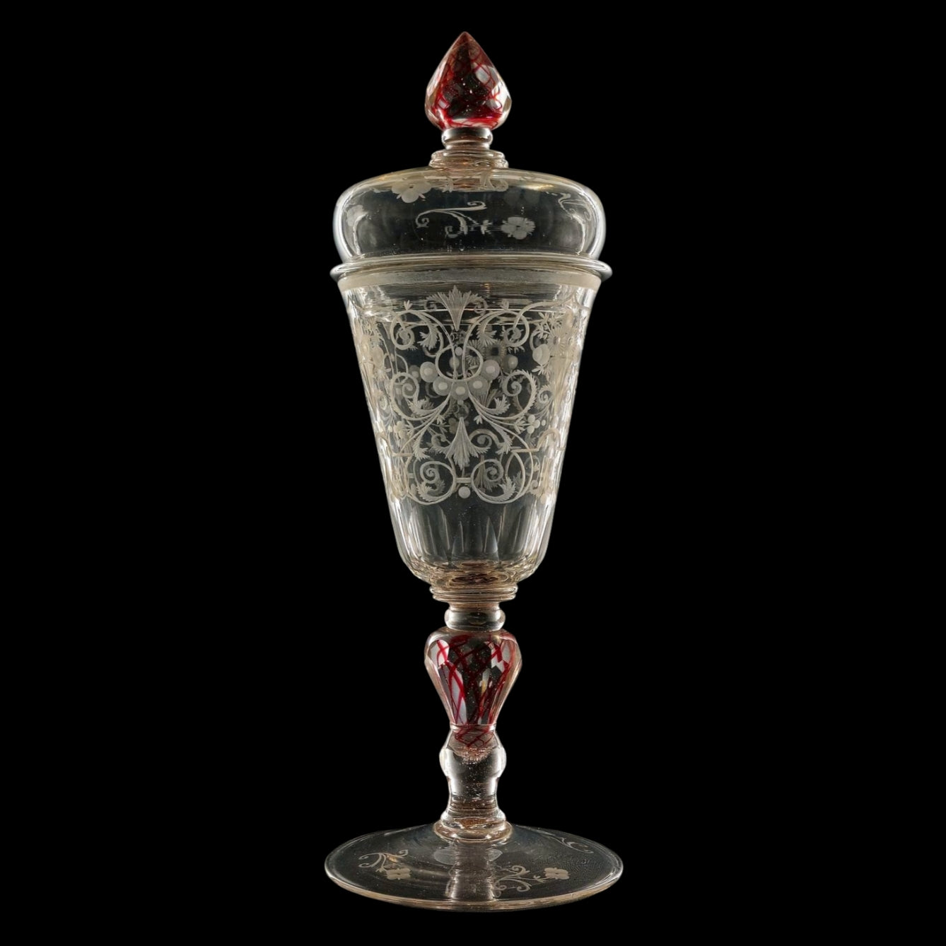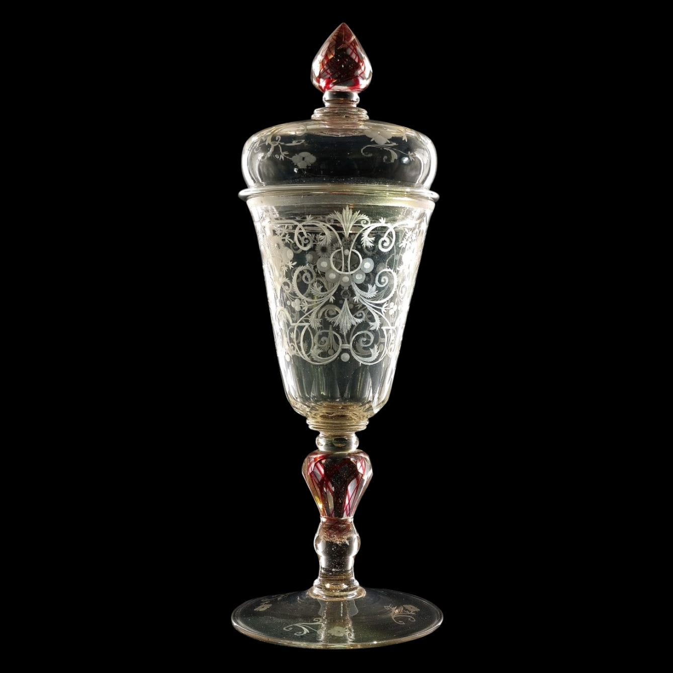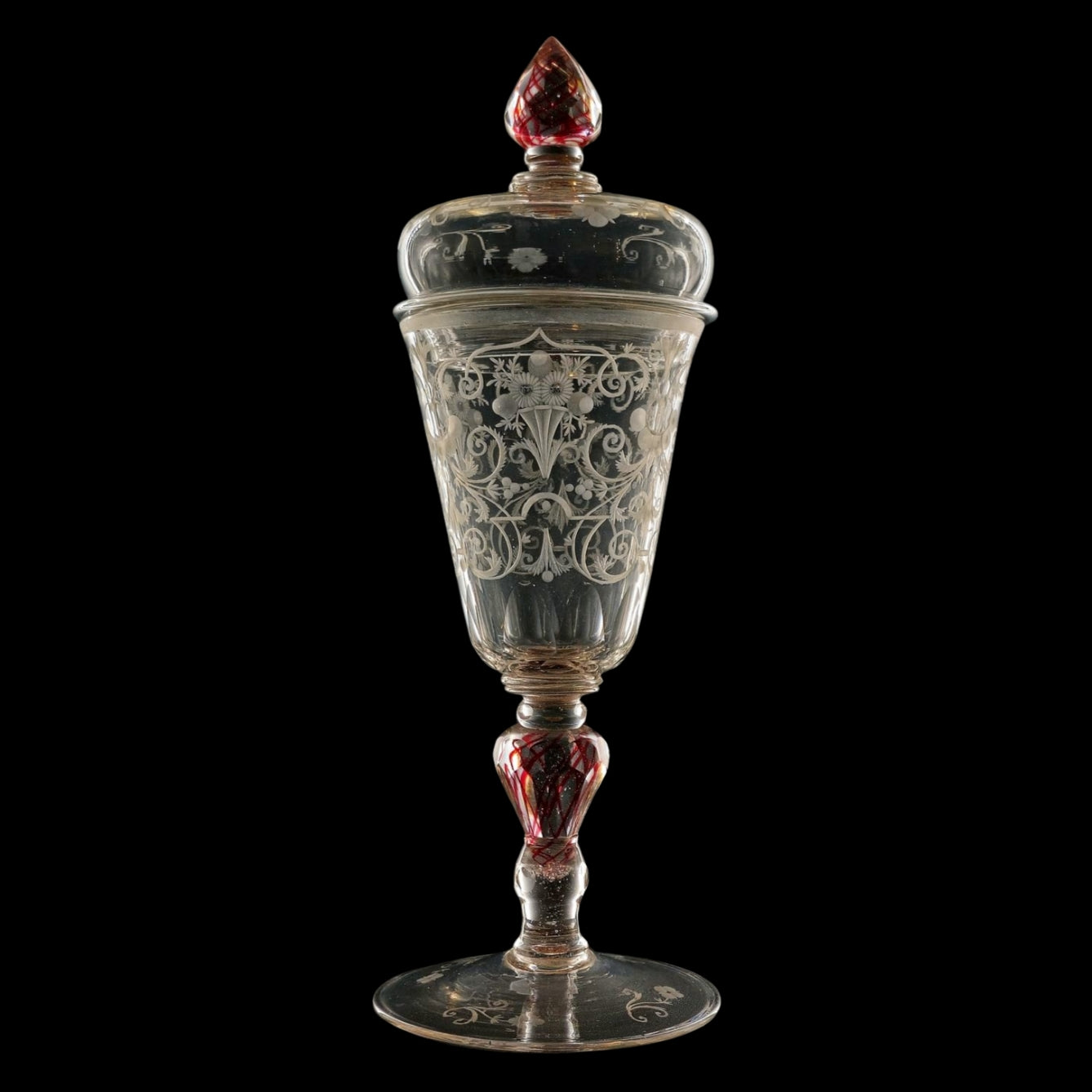 A rather fine covered cup, with ruby threads to the stem & finial and baroque engraving.