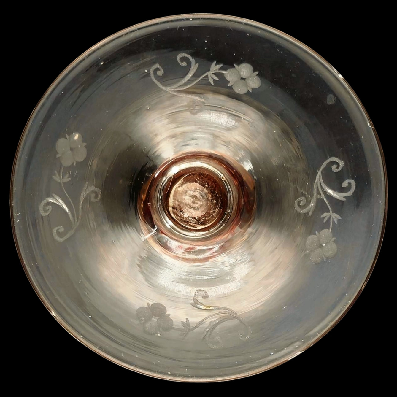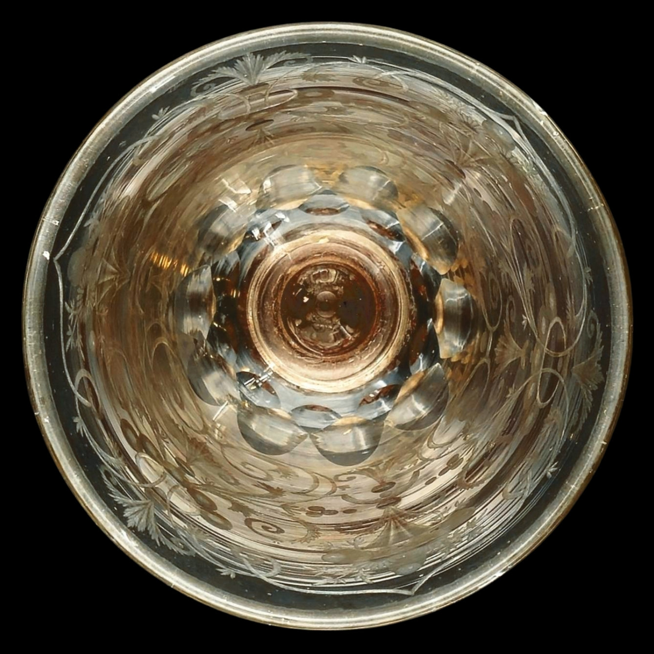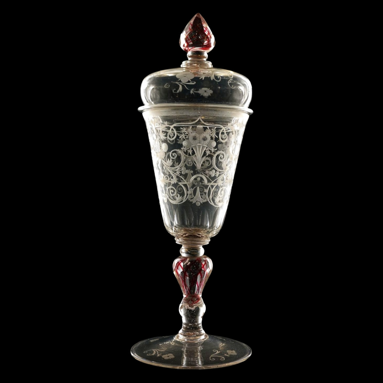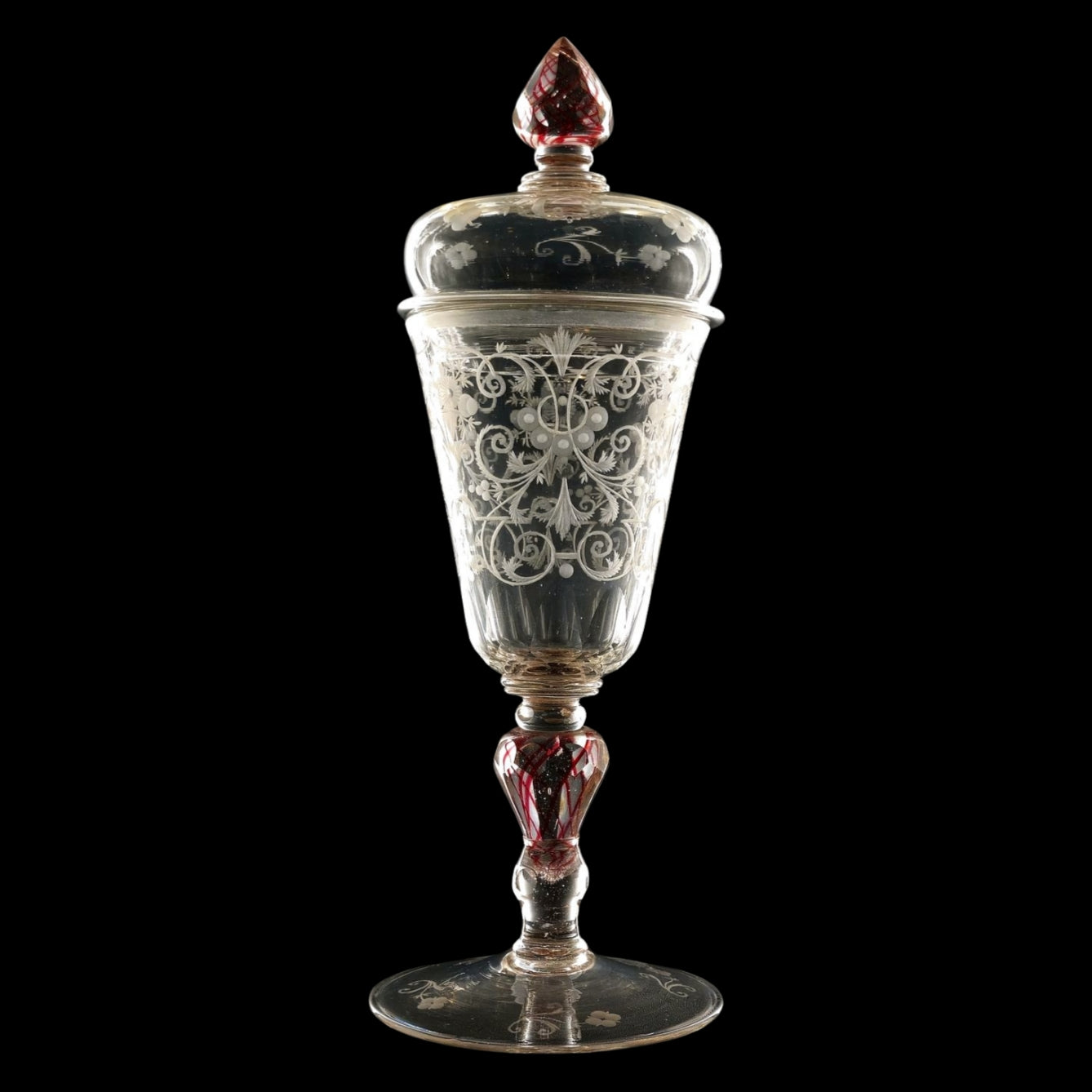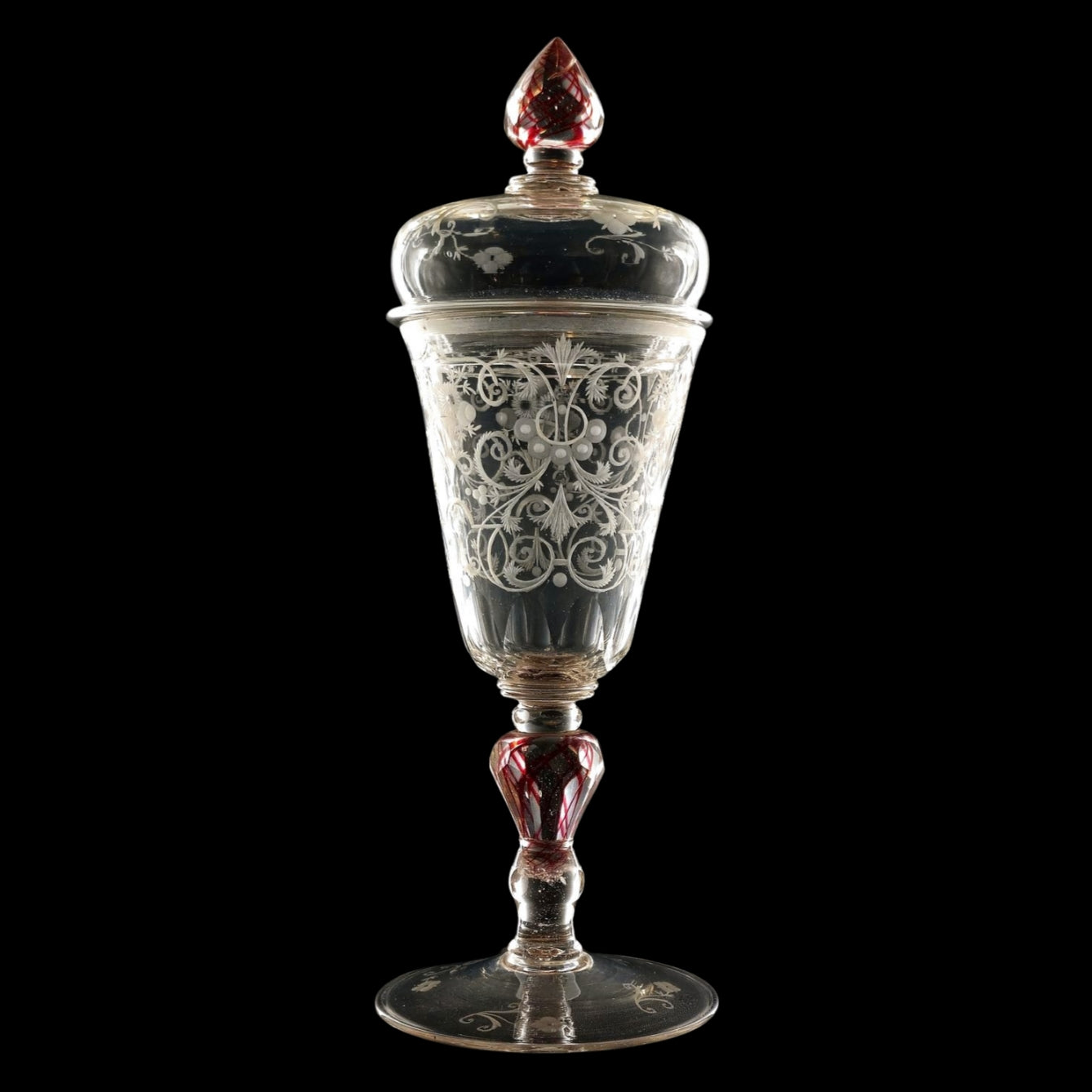 A rather fine covered cup, with ruby threads to the stem & finial and baroque engraving.