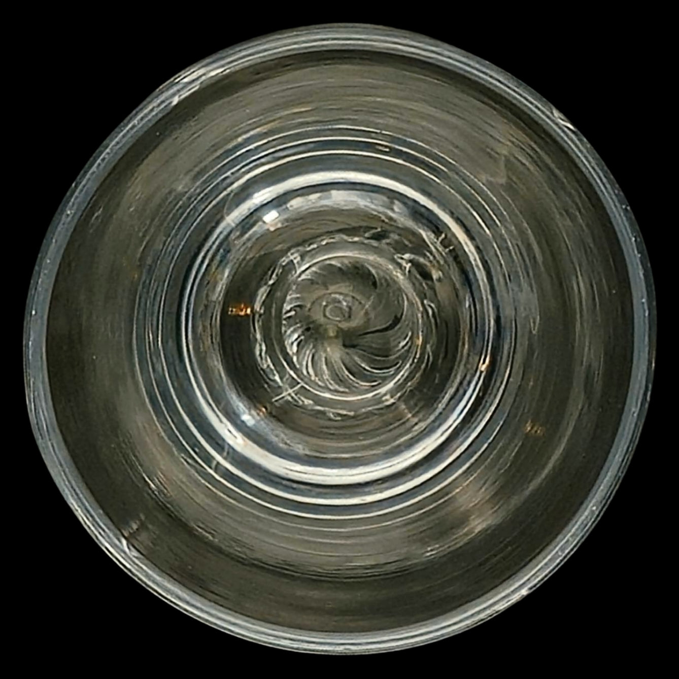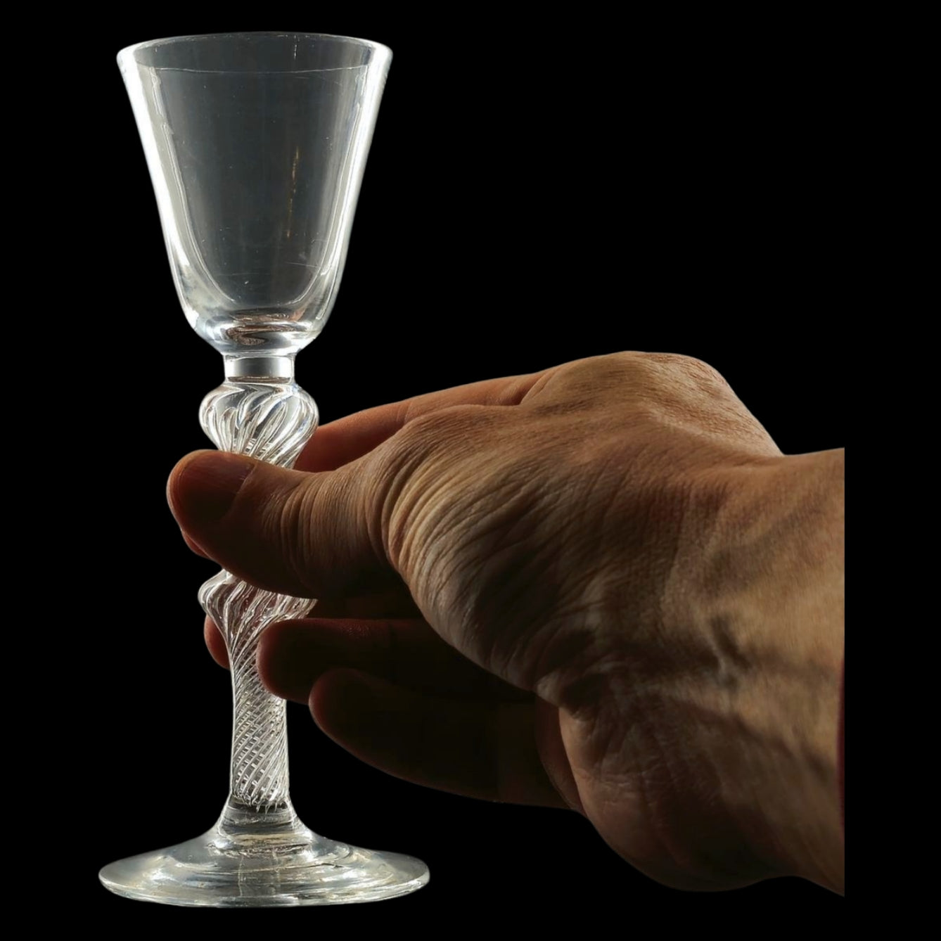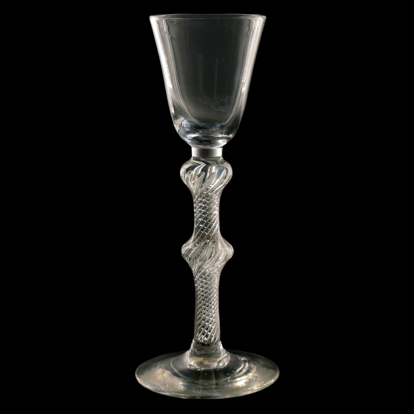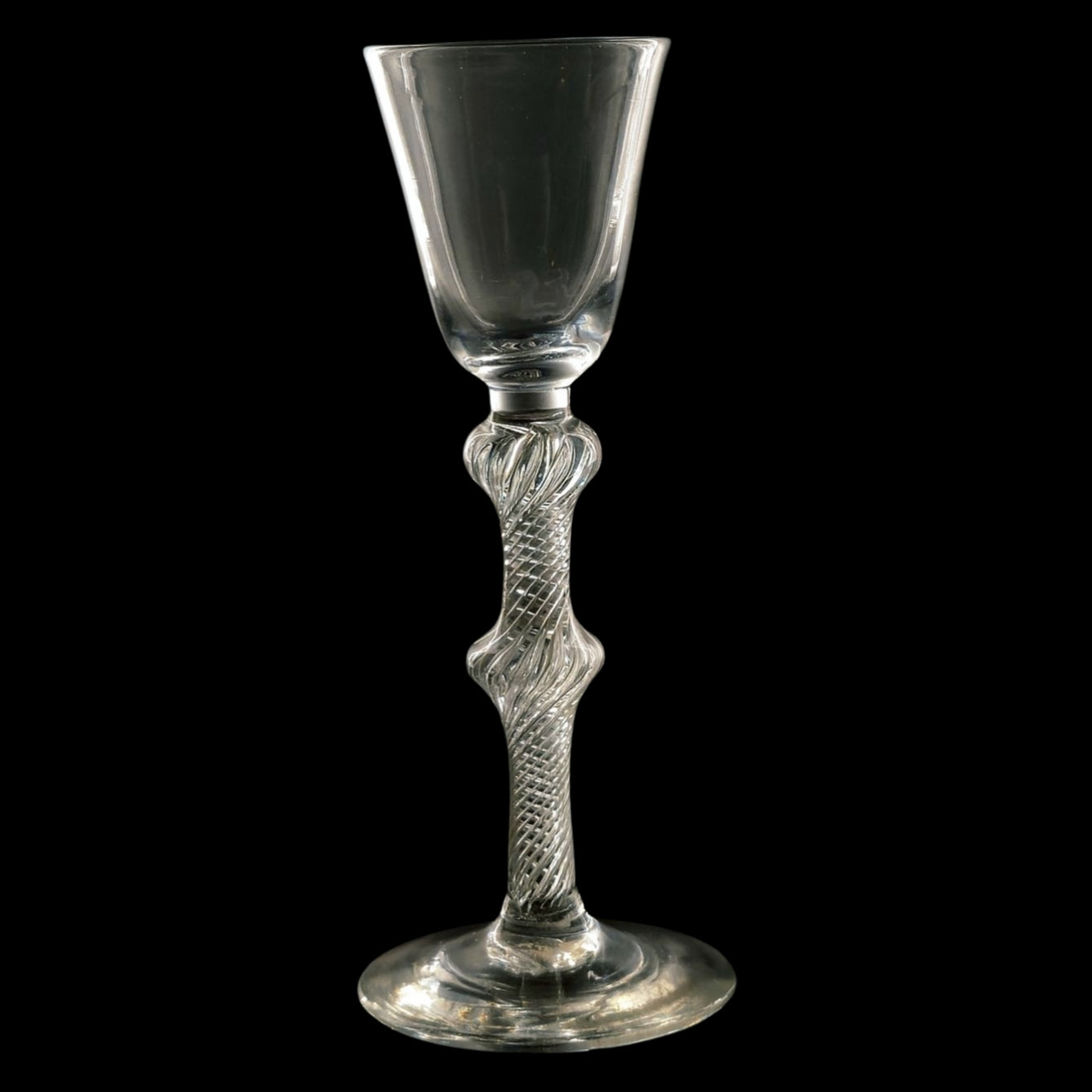 Round funnel bowl, multiple spiral air twist., Two knops composite stem, and a Conical, flat foot.