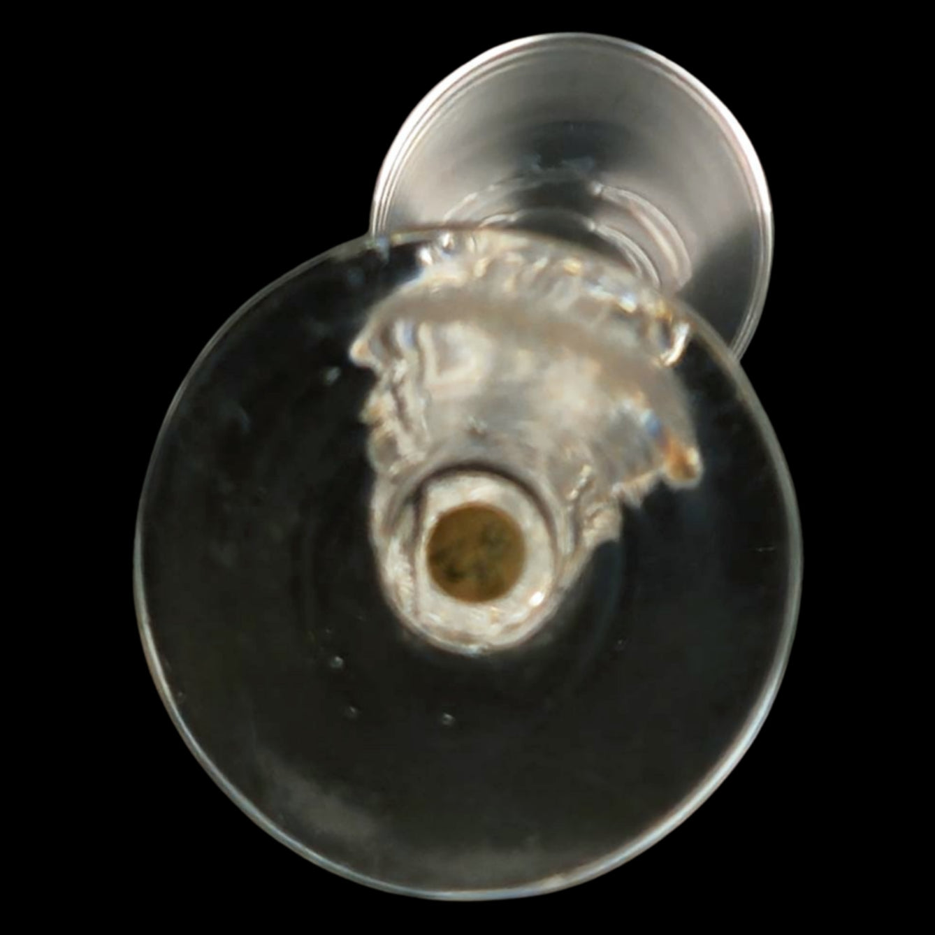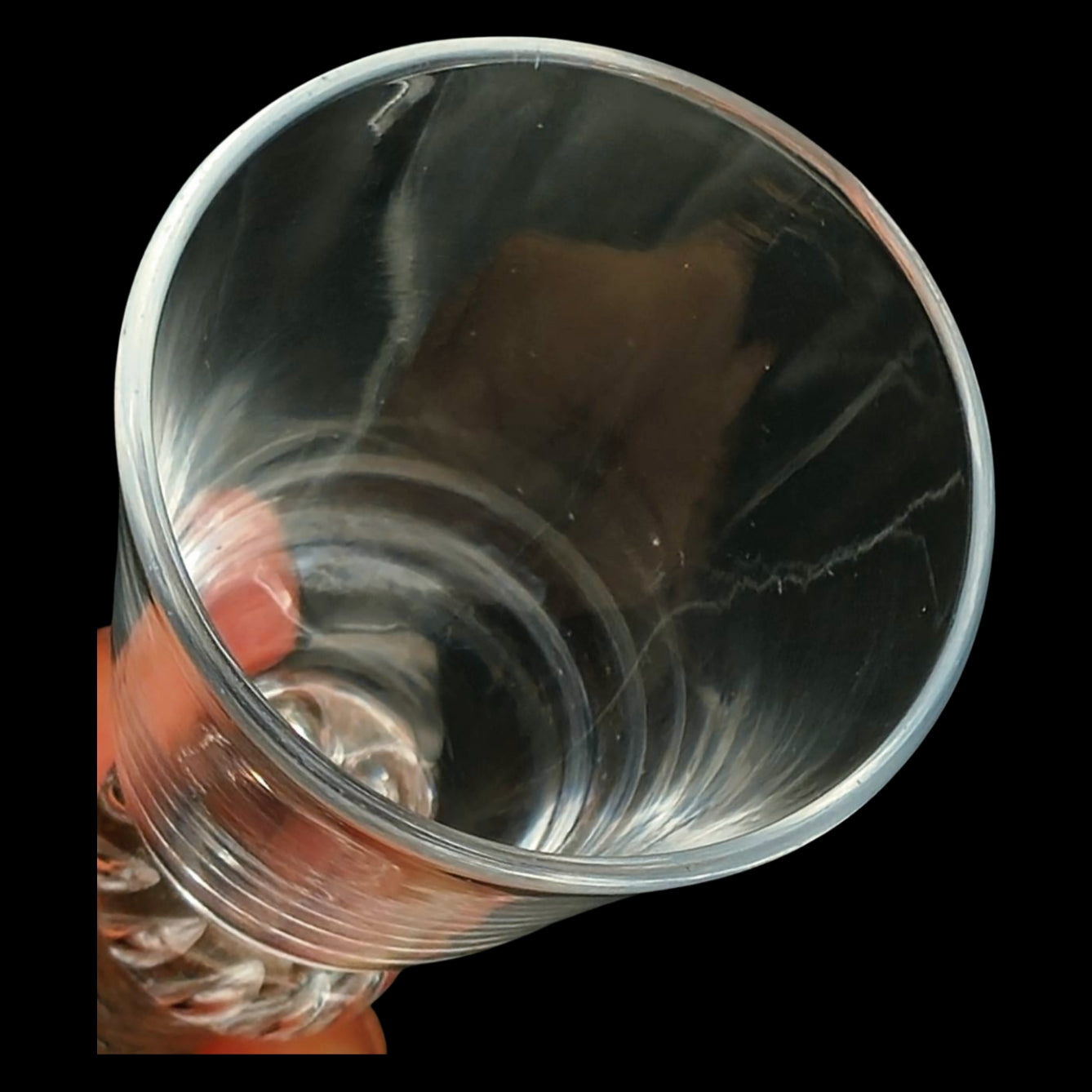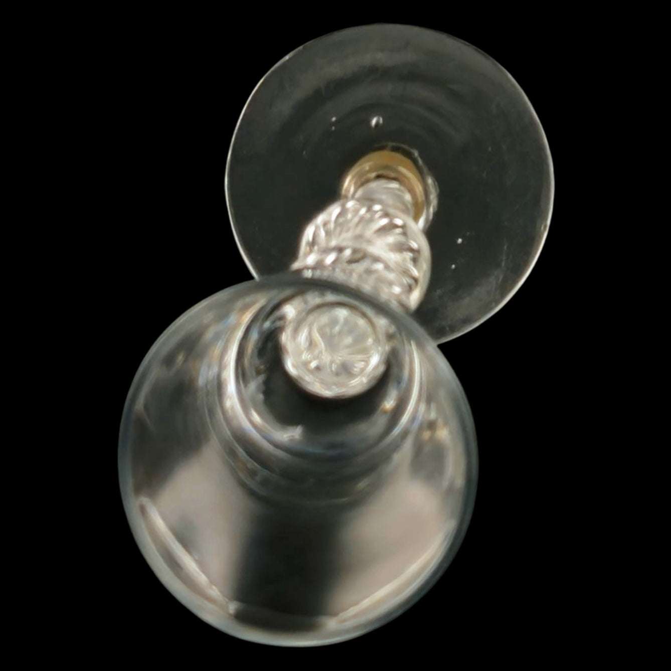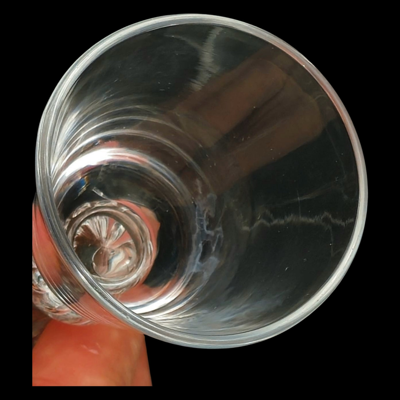 Round funnel bowl, multiple spiral air twist., Two knops composite stem, and a Conical, flat foot.