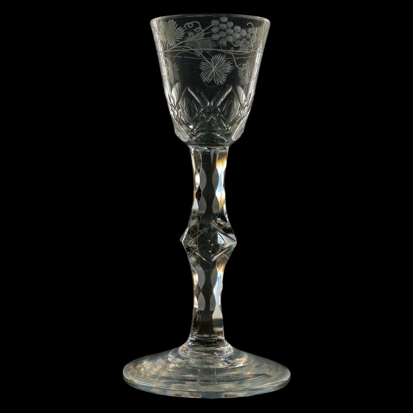 An elaborate wine glass, with round funnel bowl with scale-cut facets on base, wheel-engraved with fine fruiting vine.