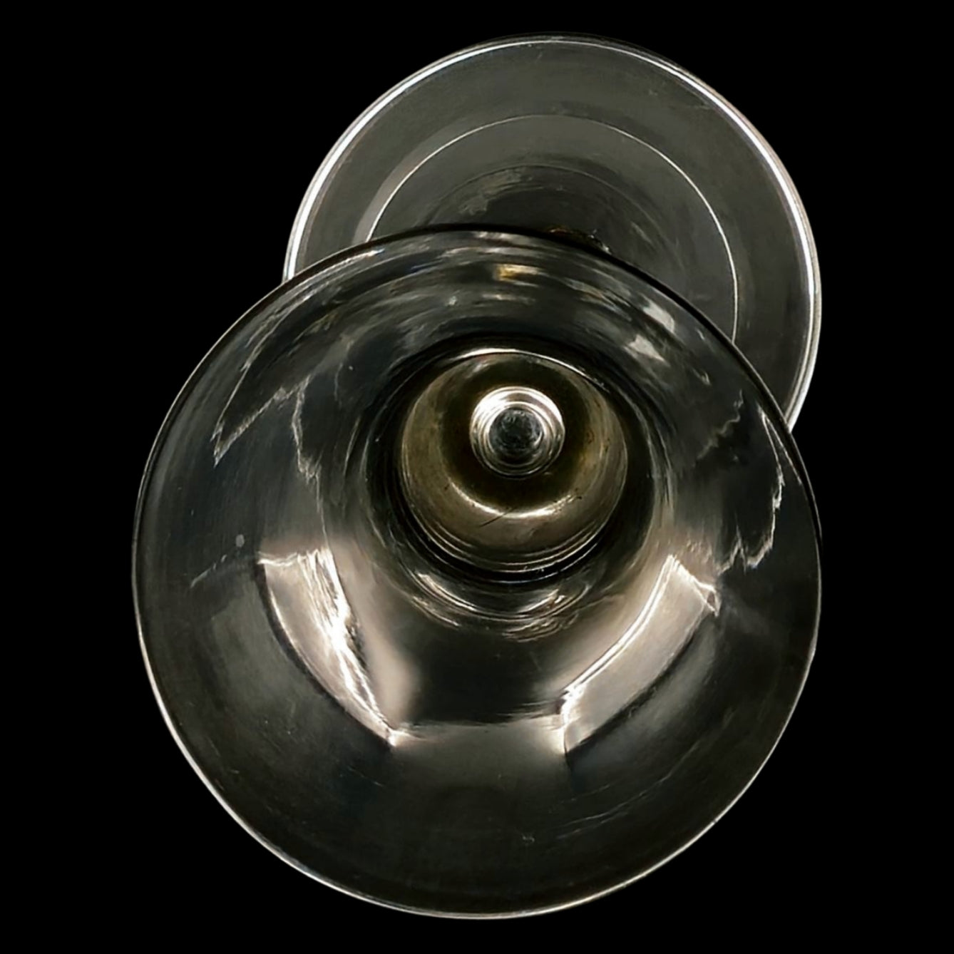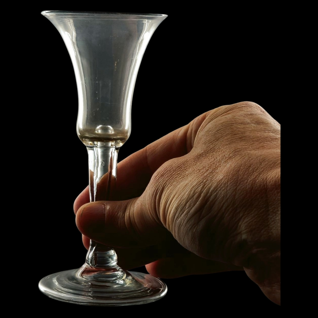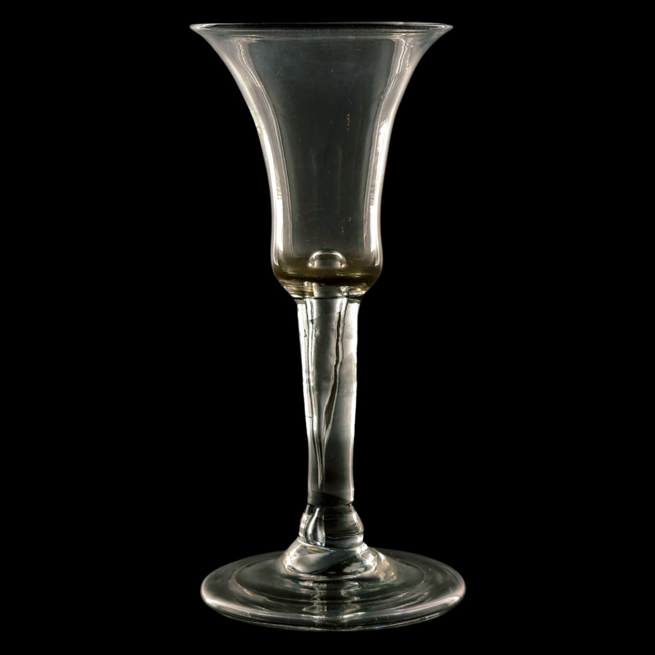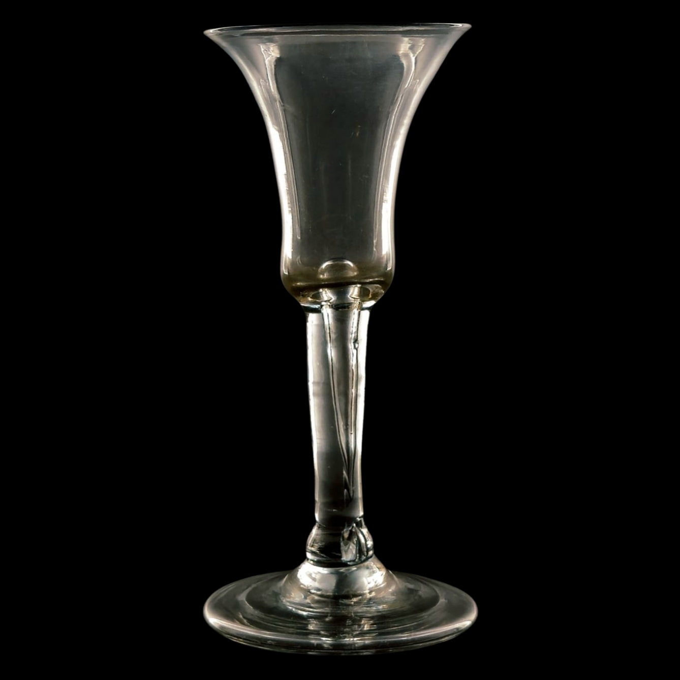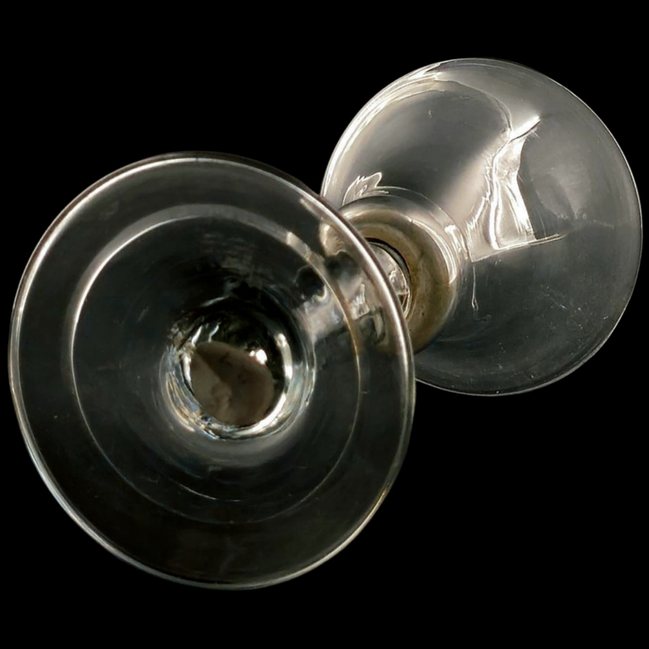 A tear-stem gin glass, with a bell bowl and a folded conical foot. A most attractive example of an early form of air bubble.