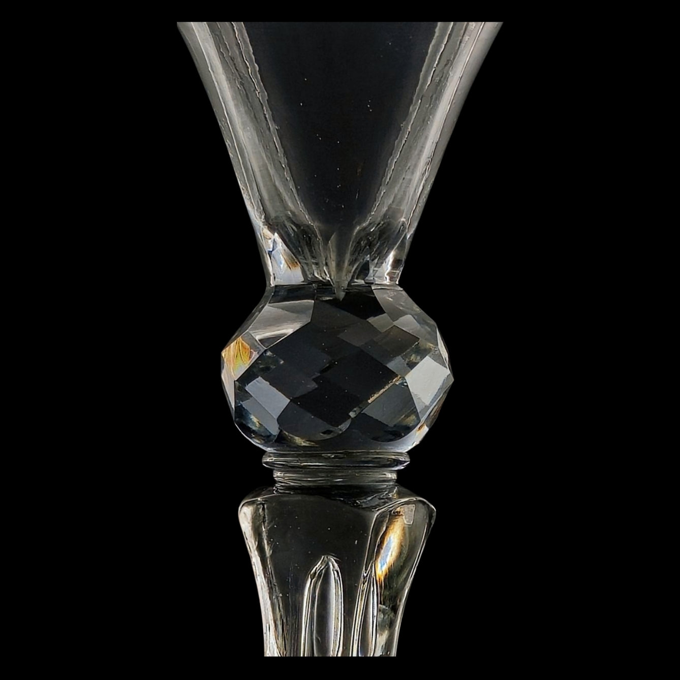 An outstanding example of Queen Anne faceting, on a four-sided stem - rare enough in itself. The cutting has slight concave surface you would expect for contemporary facetting at this time.