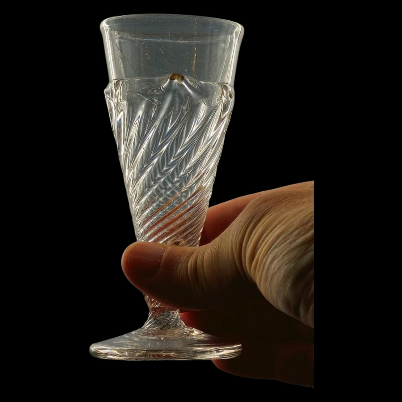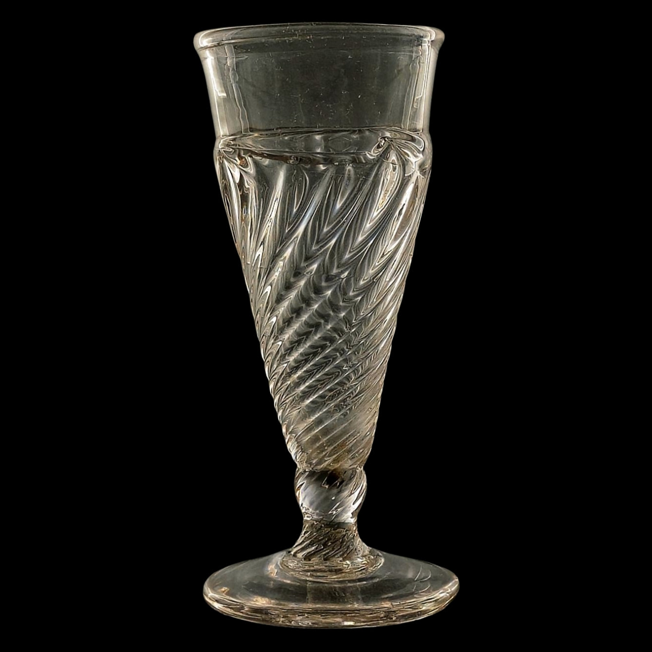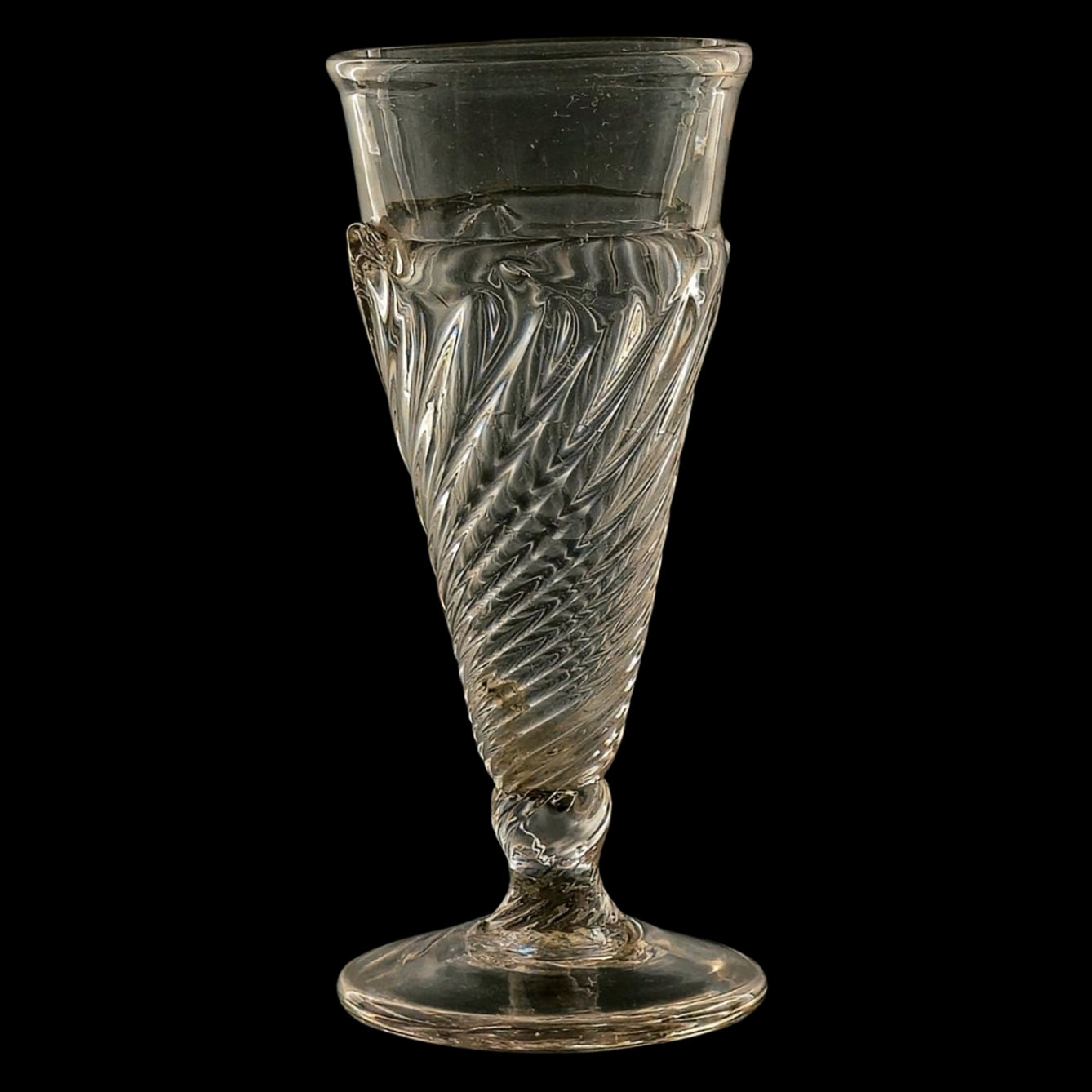 A flamiform dwarf ale glass, with conical bowl and wrythen applied moulding.