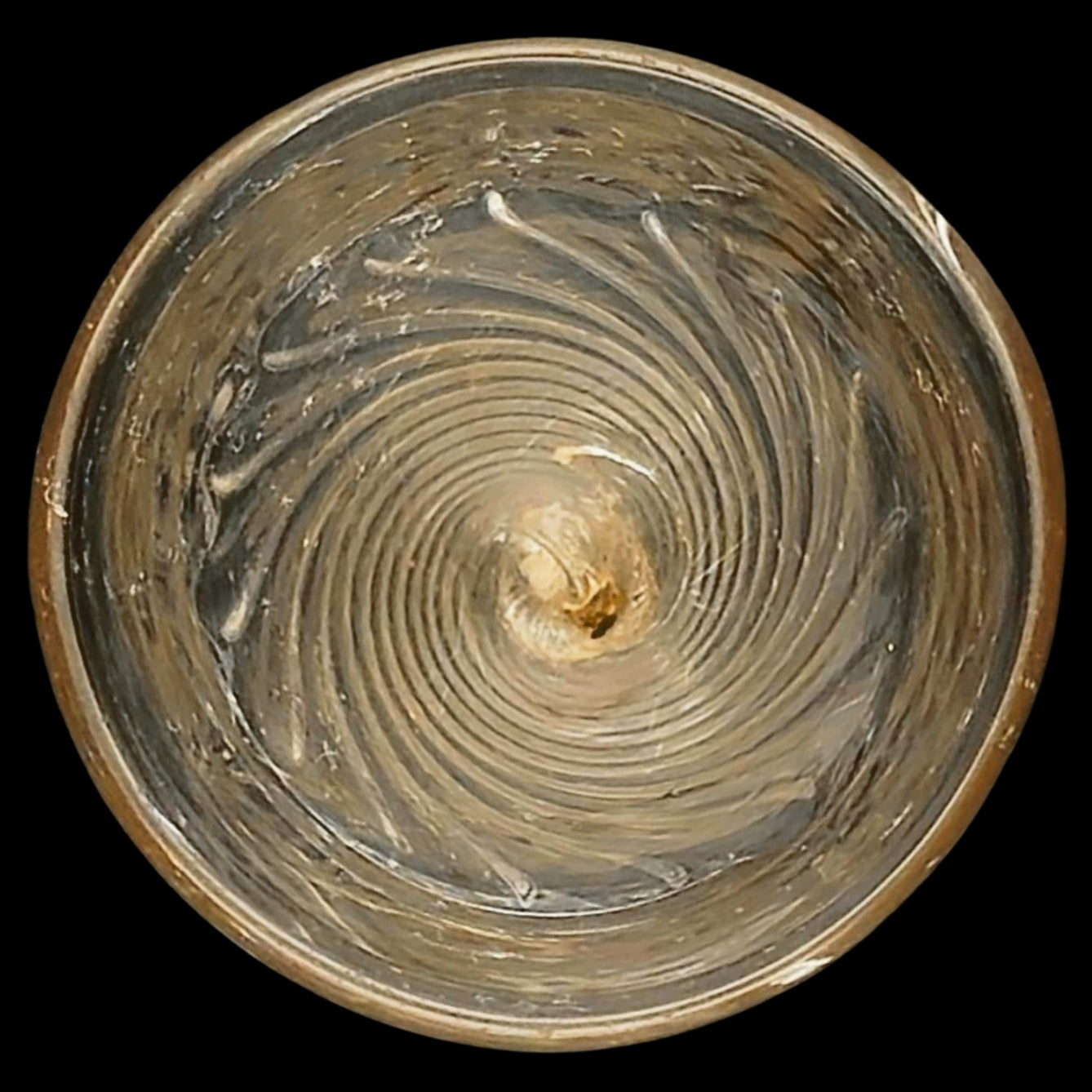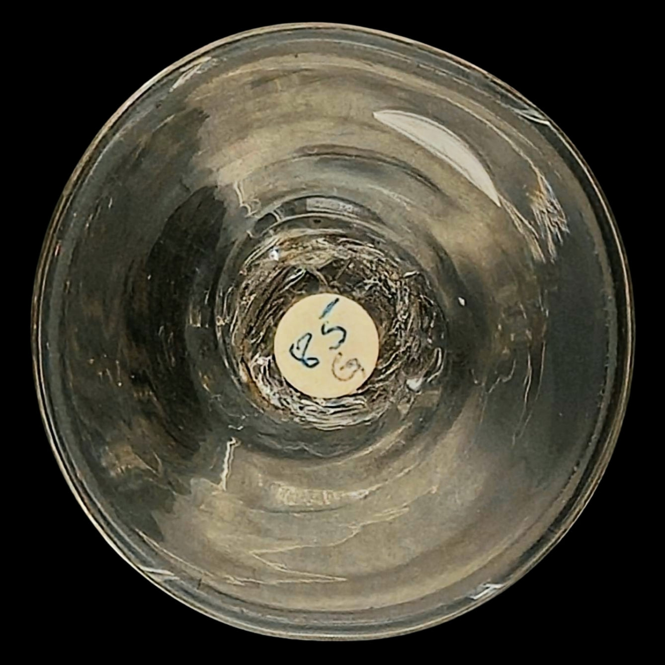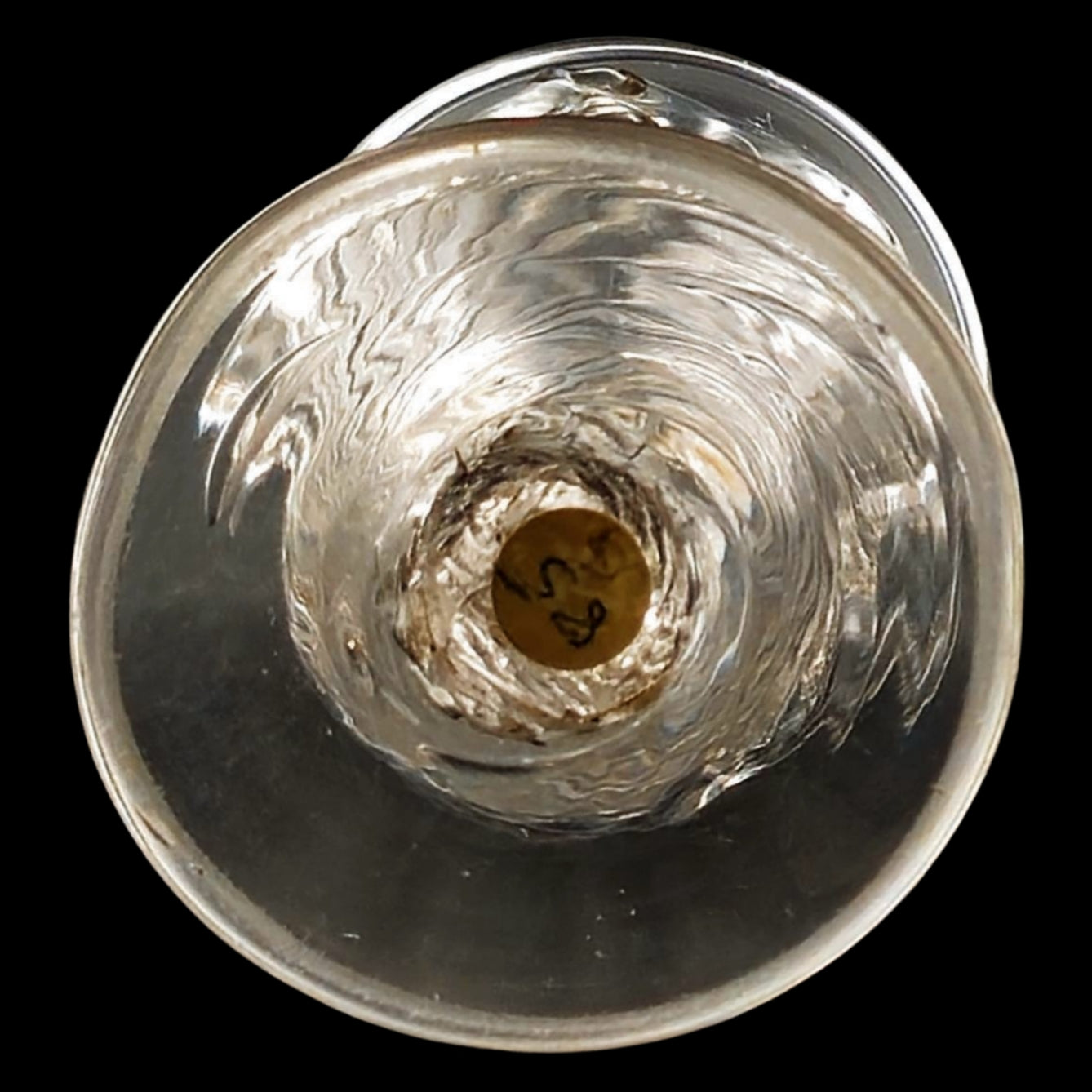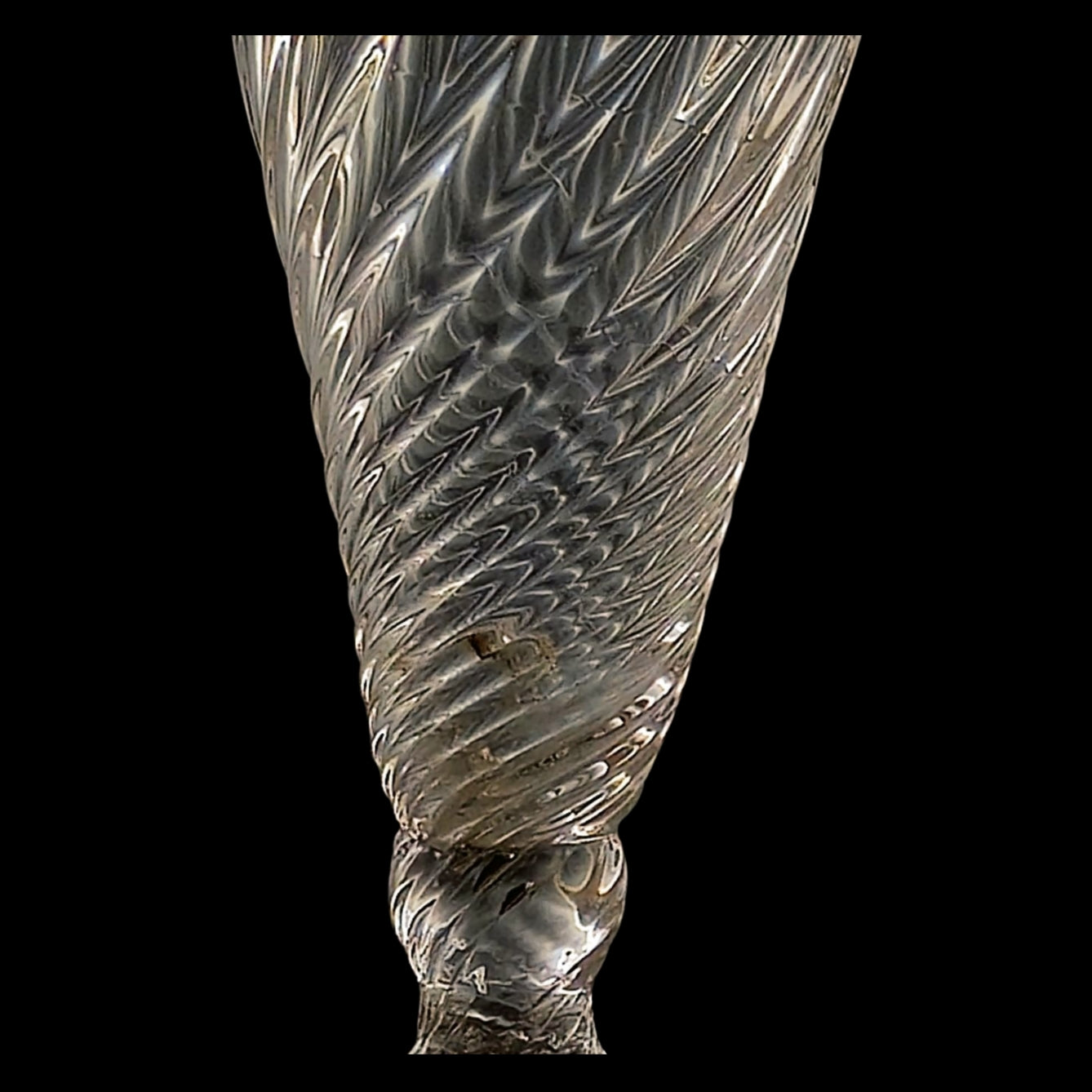 A flamiform dwarf ale glass, with conical bowl and wrythen applied moulding.
