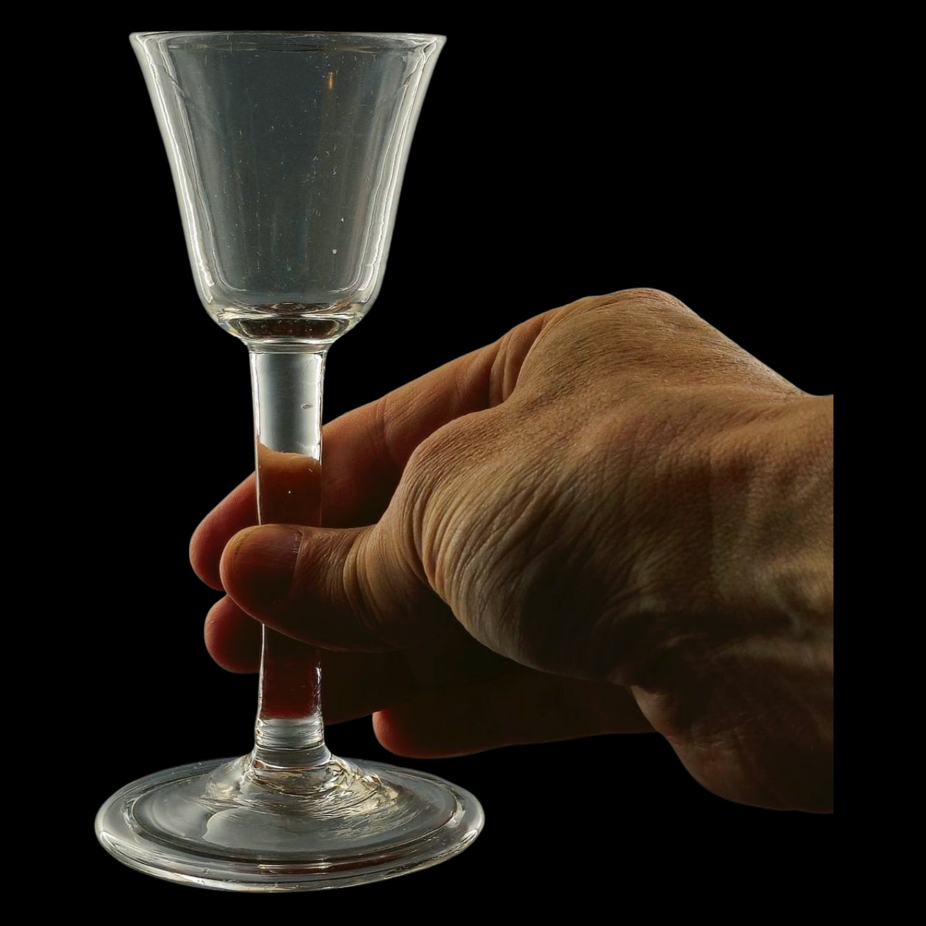 Round funnel, waisted bowl on a plain stem and folded foot. A really nice, early plain glass.