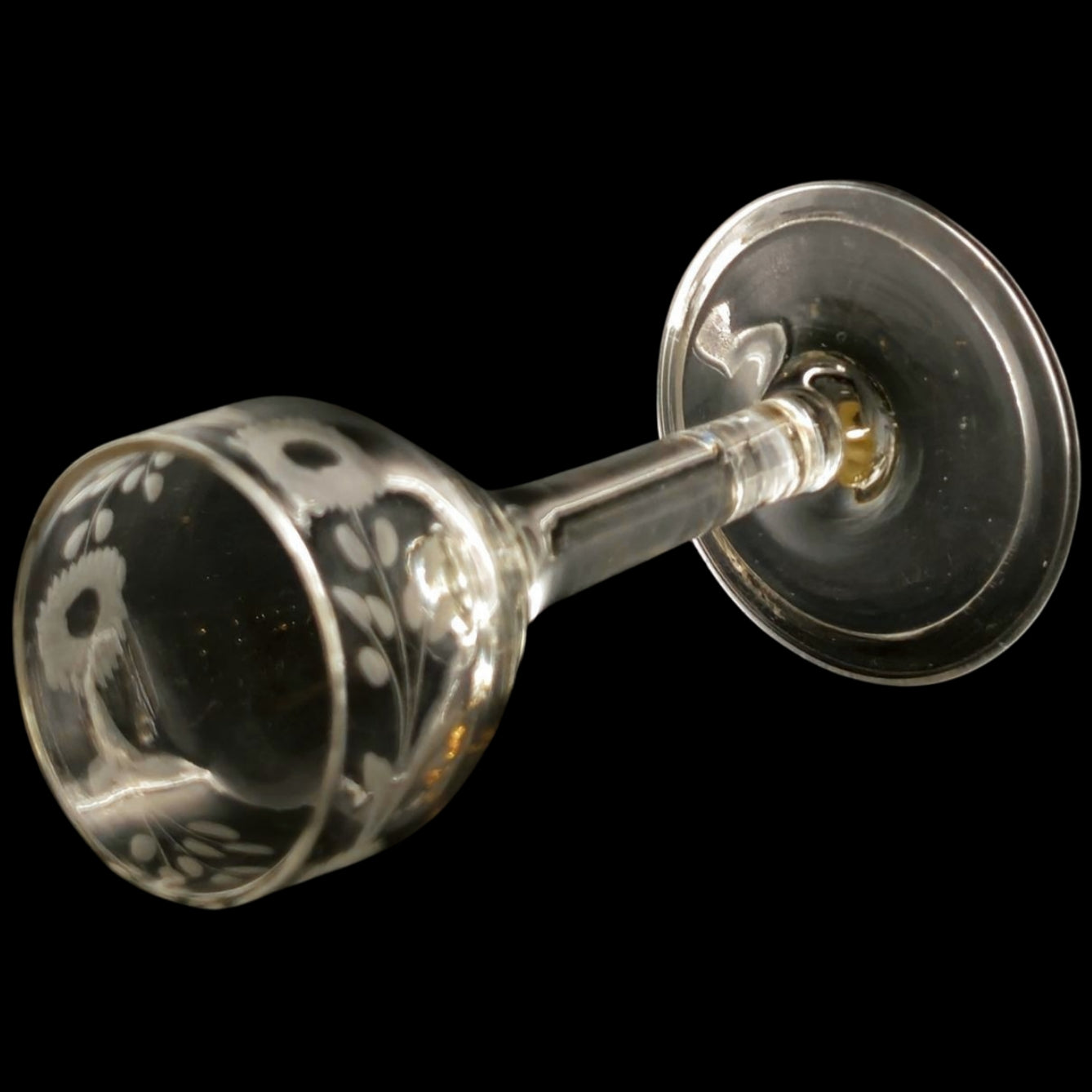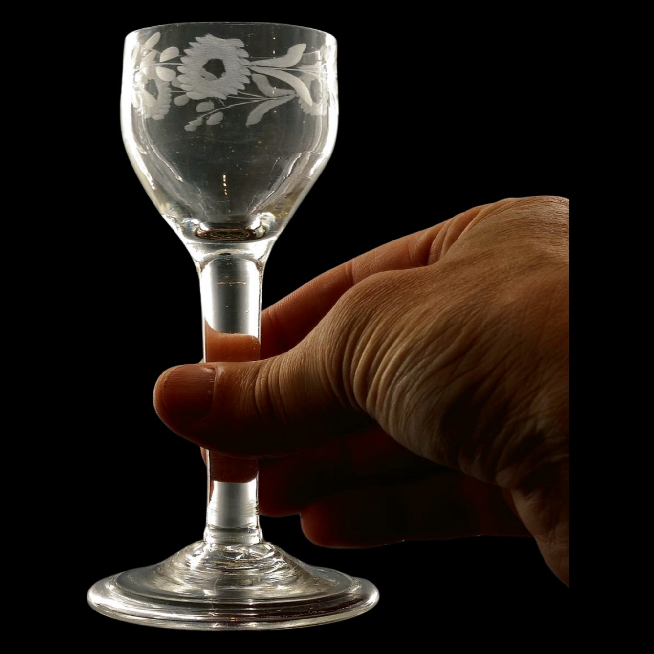 Ogee-lipped bowl and a conical folded foot. Engraved with rudimentary flowers.