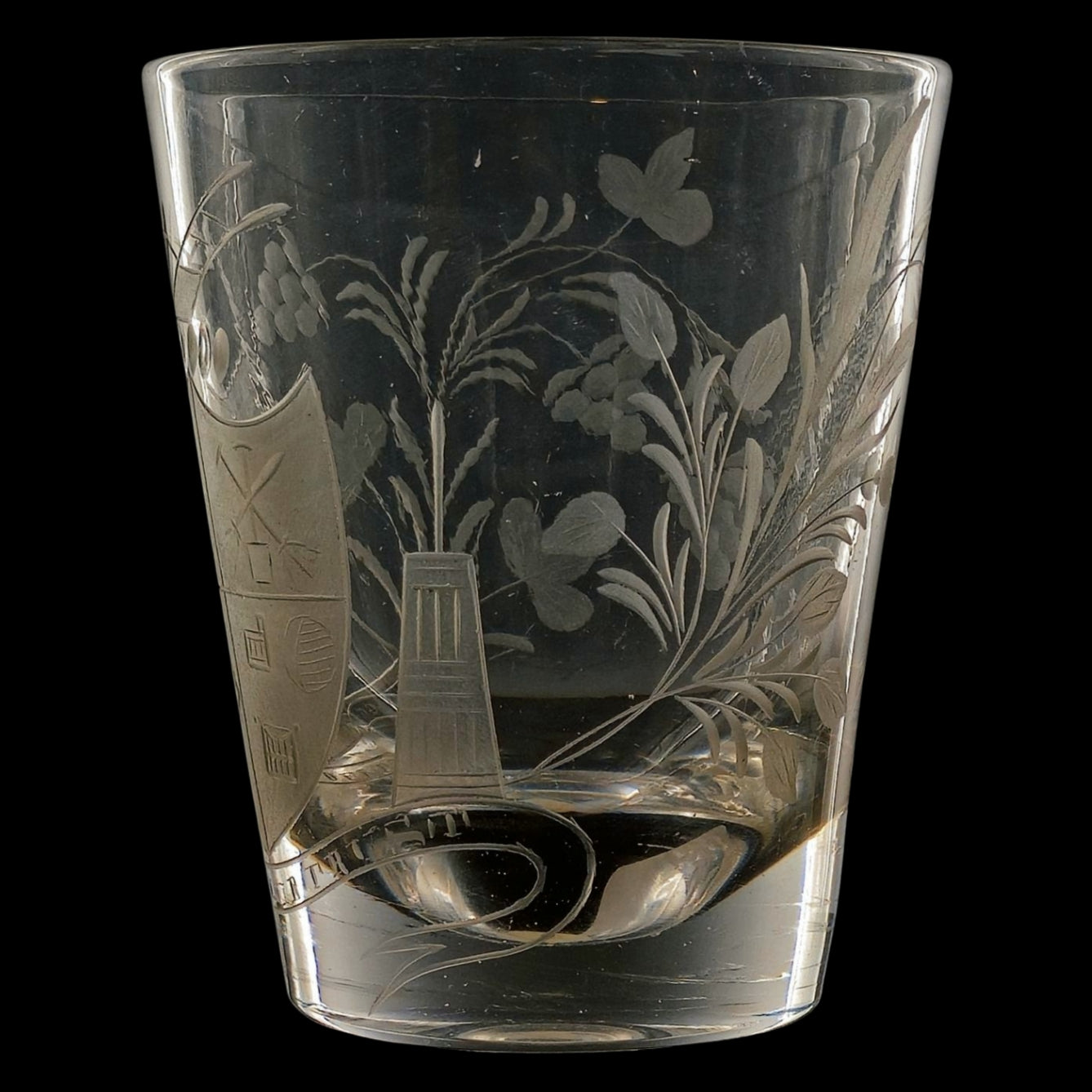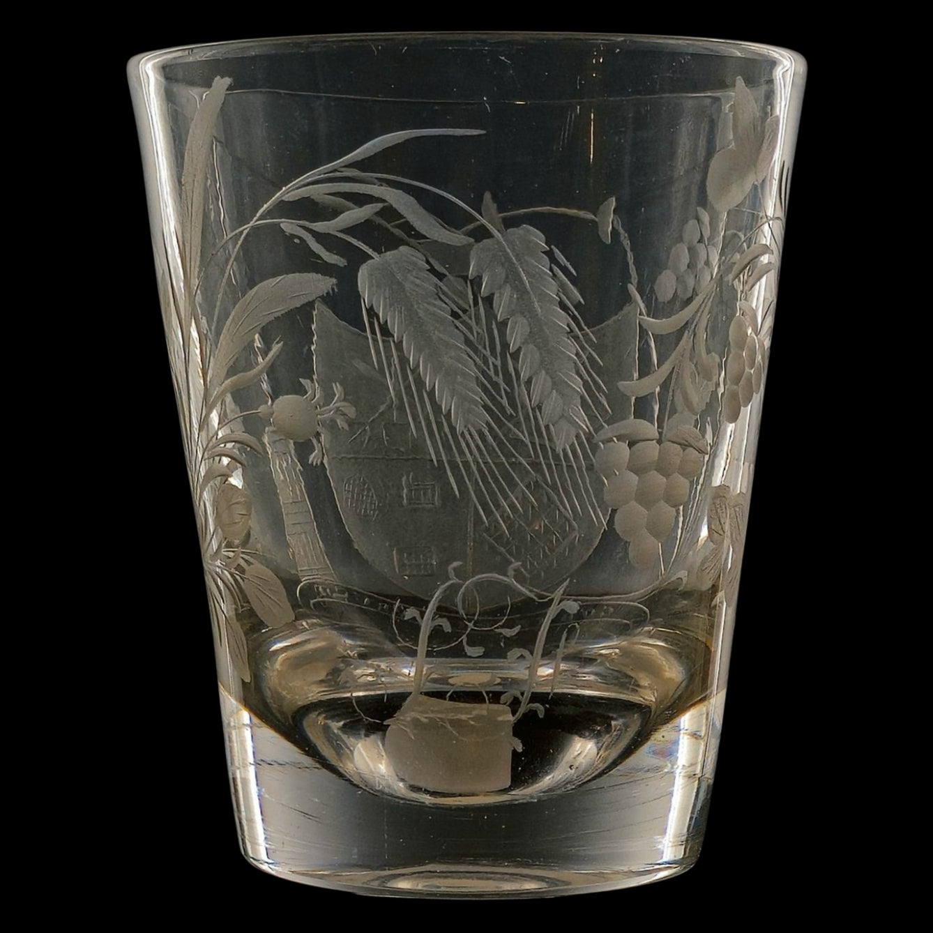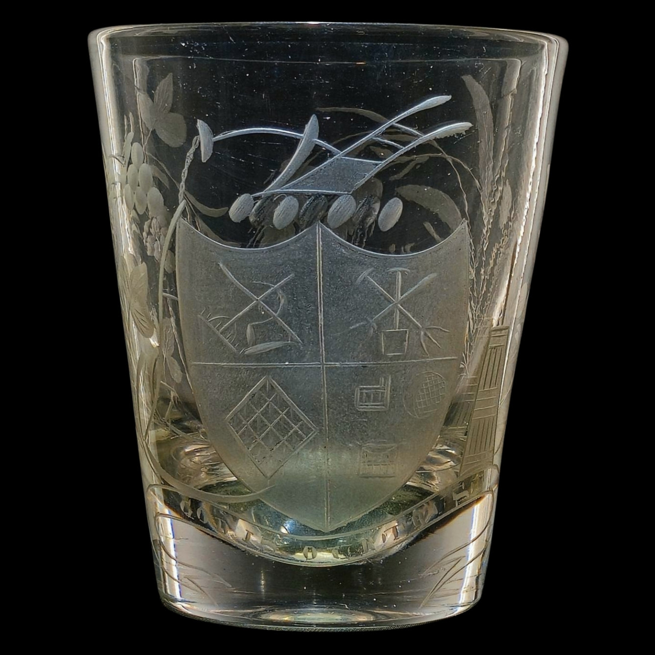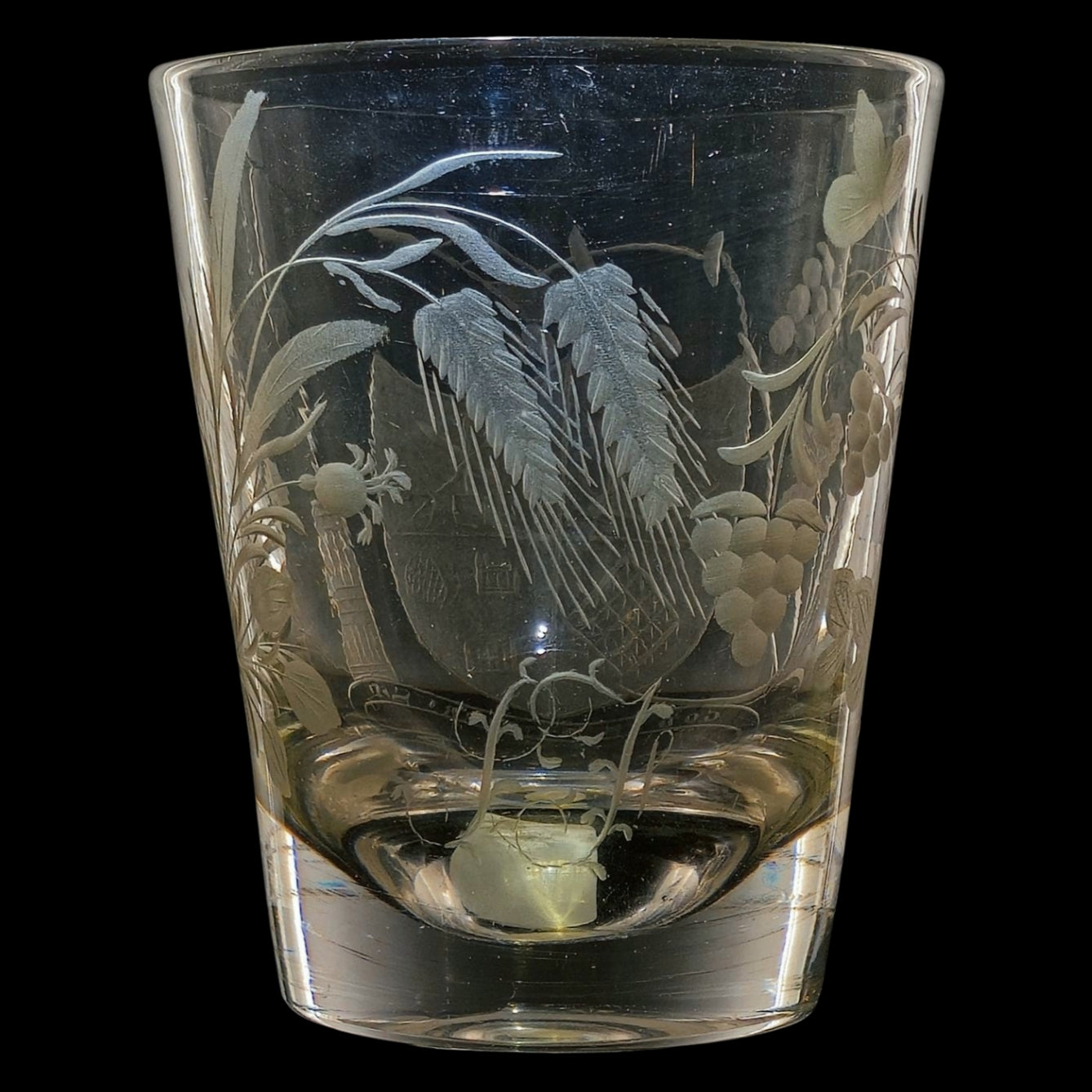 A nice pseudo-coat-of-arms, featuring various farm implements. Such designs were popular in the early 19th century. Also engraved SF, and God is our Trust.