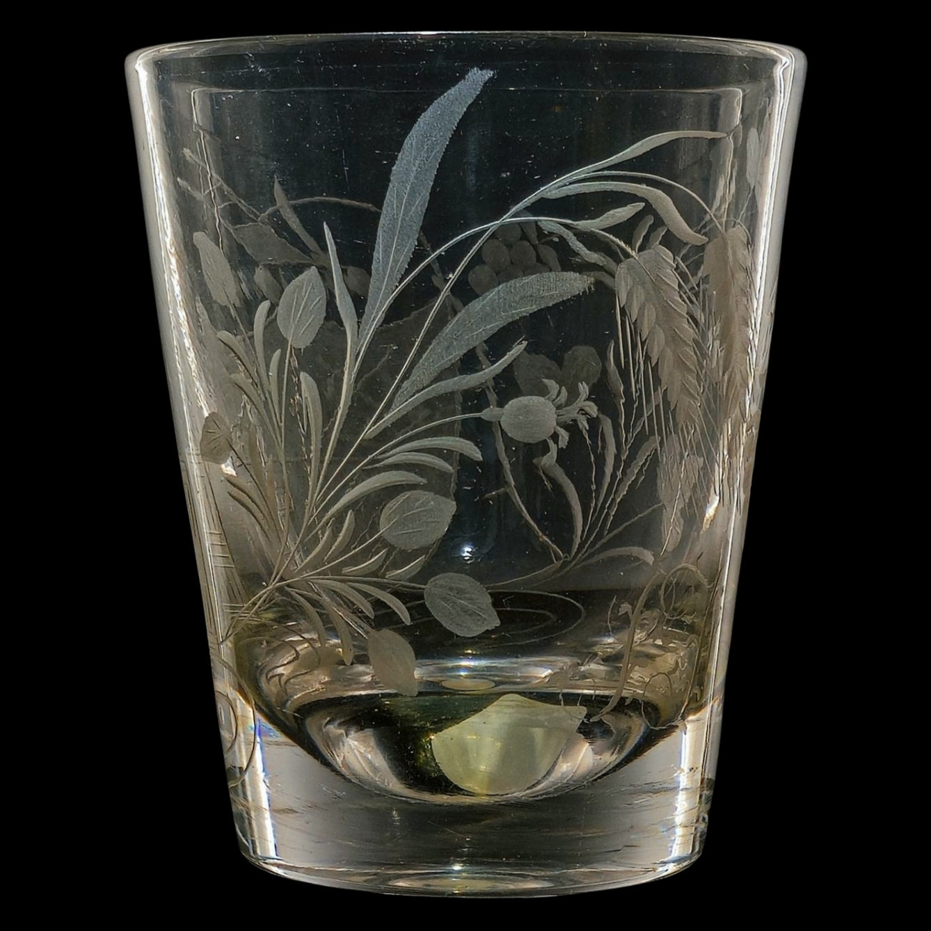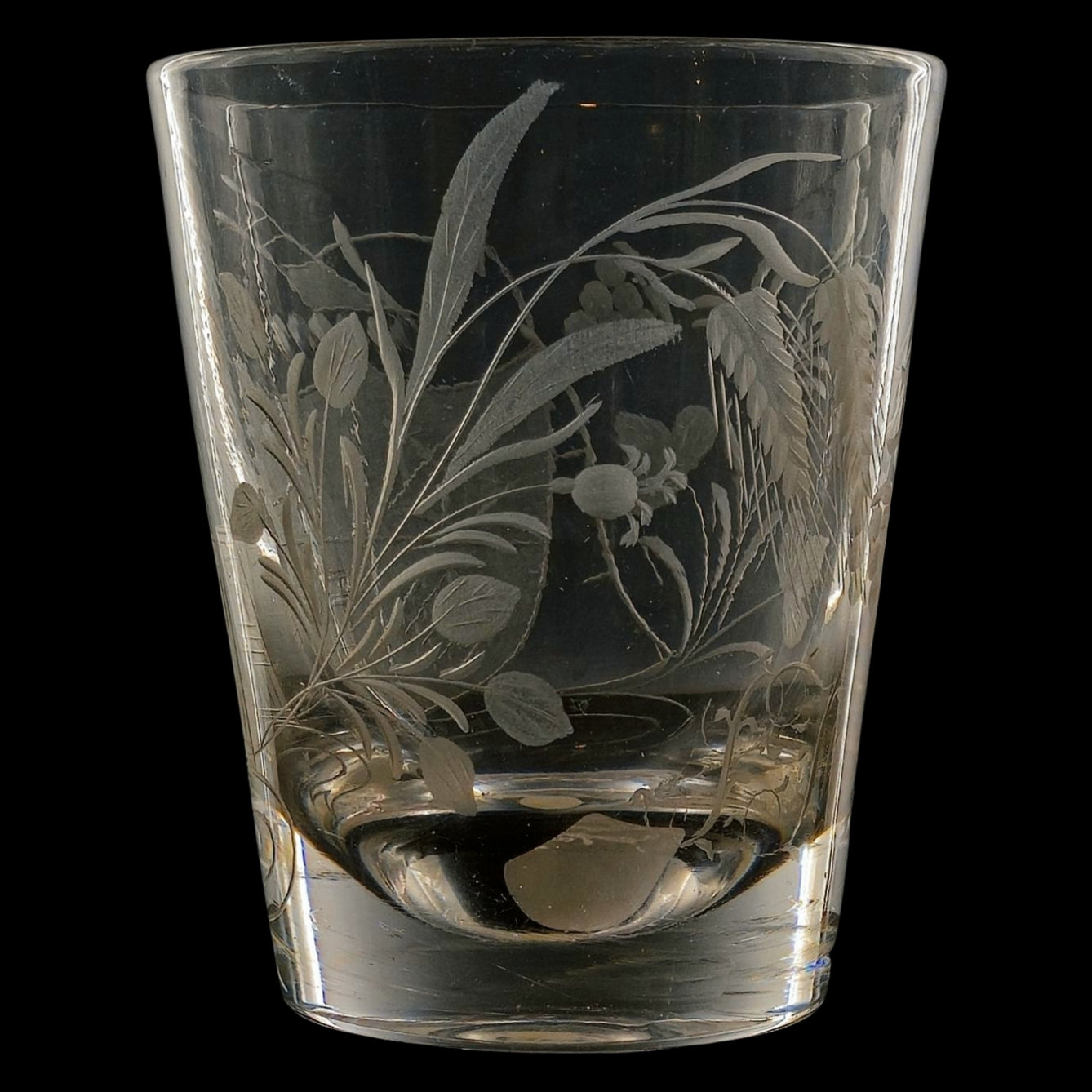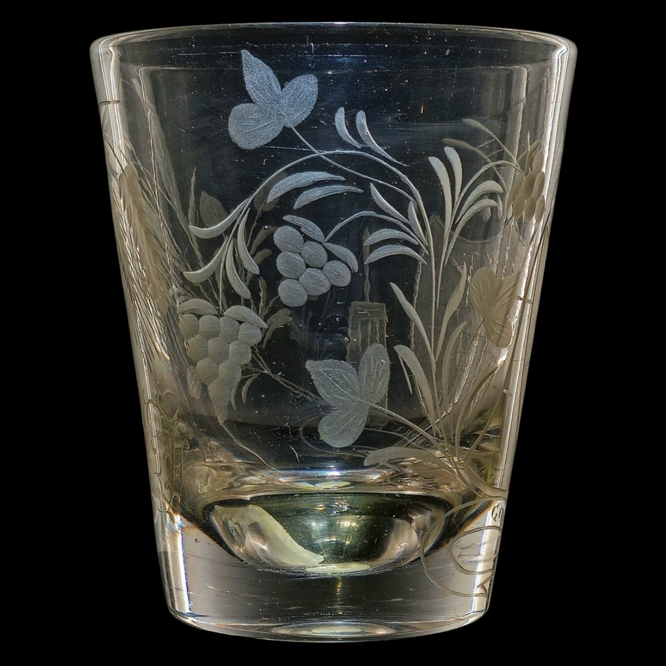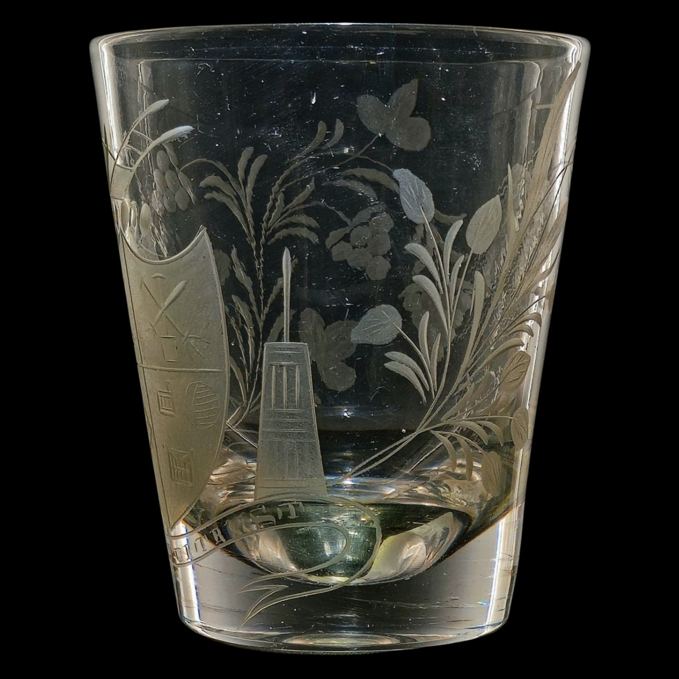 A nice pseudo-coat-of-arms, featuring various farm implements. Such designs were popular in the early 19th century. Also engraved SF, and God is our Trust.