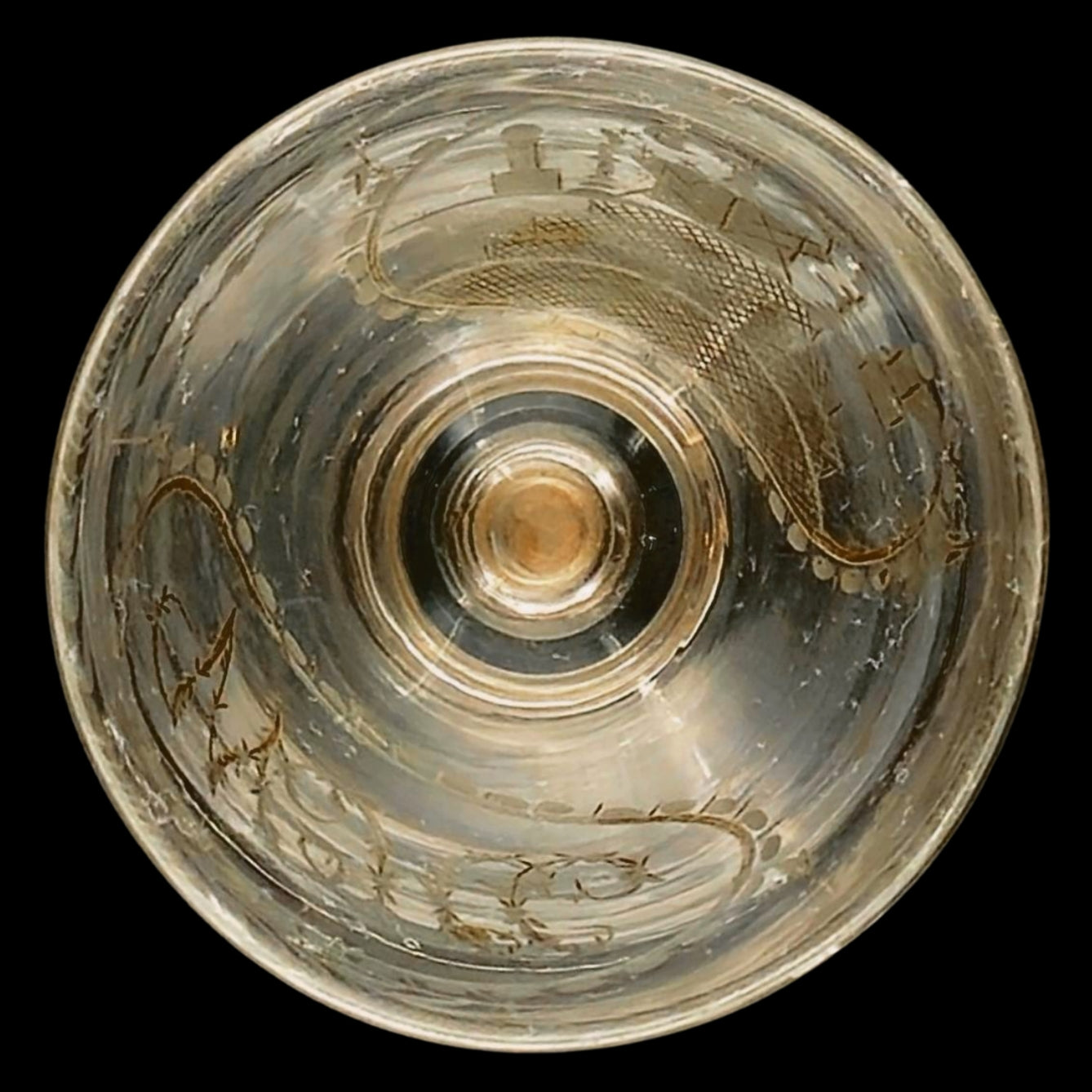 Conical bowl, plain stem, conical foot. Masonic engraving with the initials WHCC.