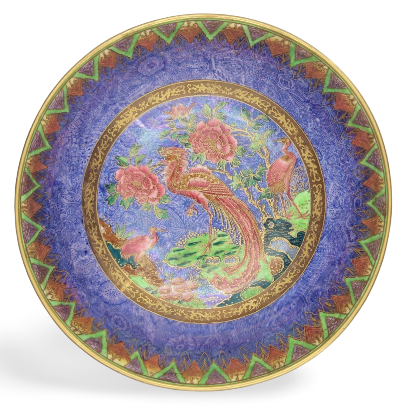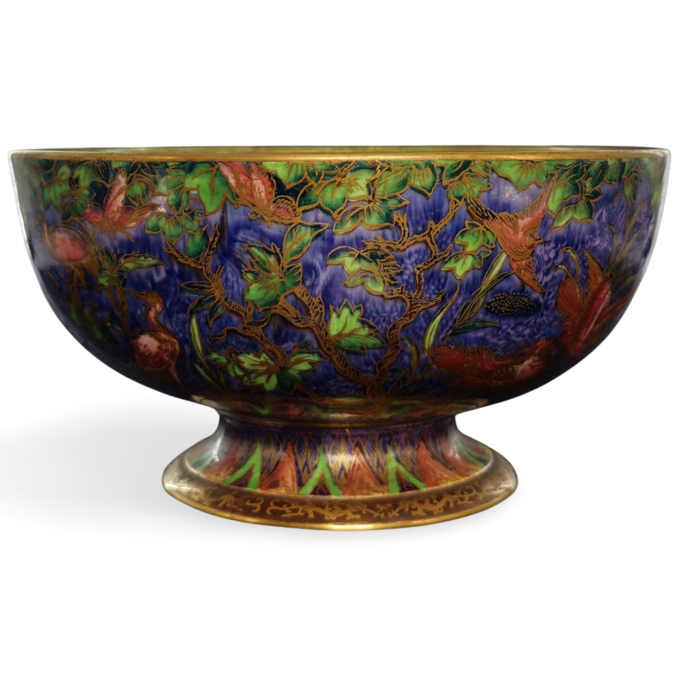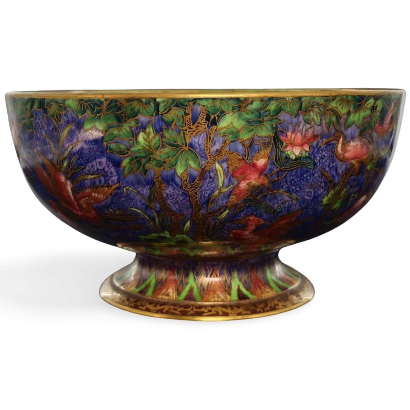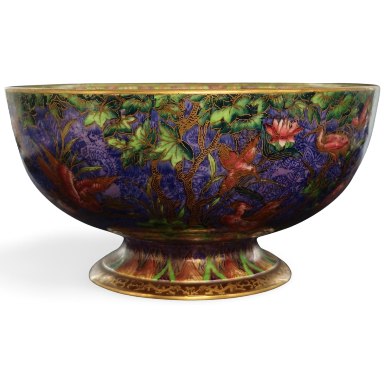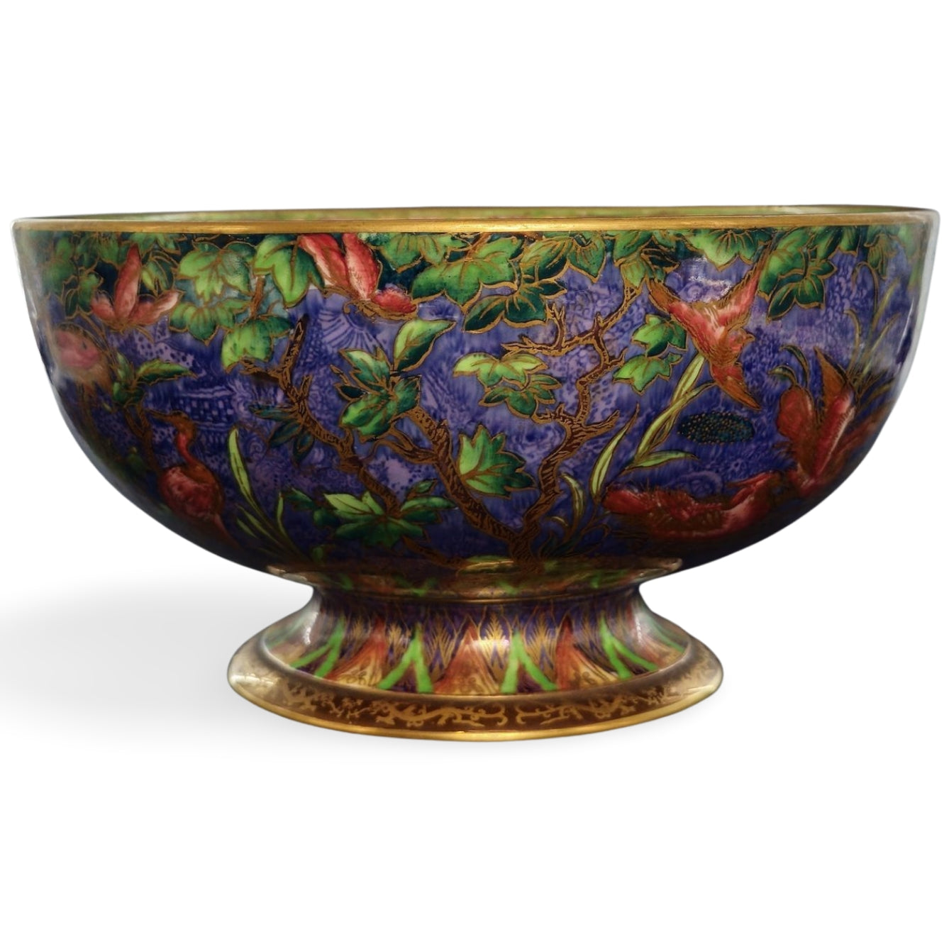 Lustreware footed bowl, in bone china. An attractive shape; decorated with the striking Argus pheasant pattern. A quintessentially art deco example of Daisy Makeig-Jones' work.