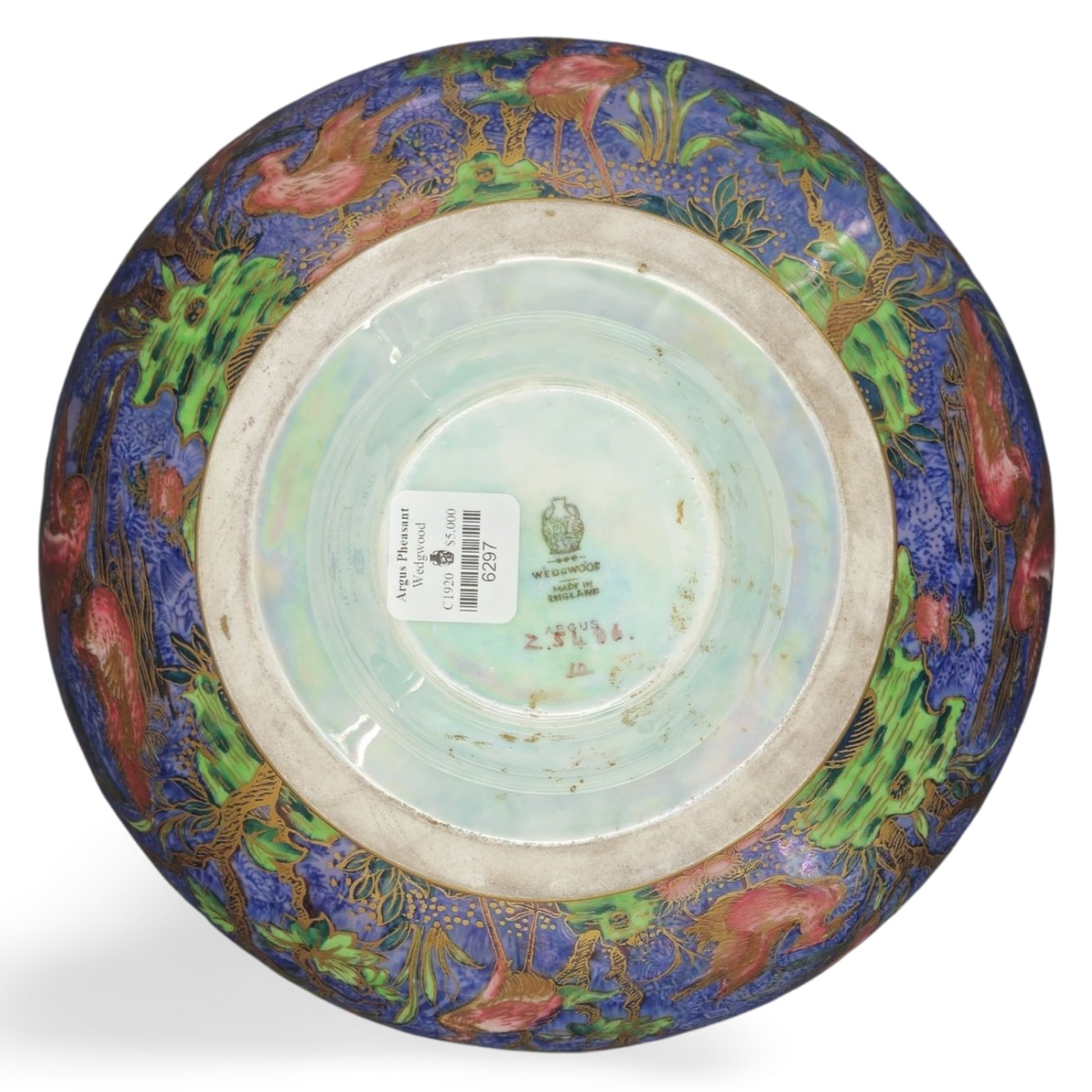The pattern features decorative depictions of the Argus pheasant, a bird known for its striking plumage and elaborate patterns on its feathers, which makes it a fitting subject for Wedgwood's artistic ceramic pieces. The bird is shown in flight amongst foliage on the sides, and male and female birds stand in the bottom of the bowl.
