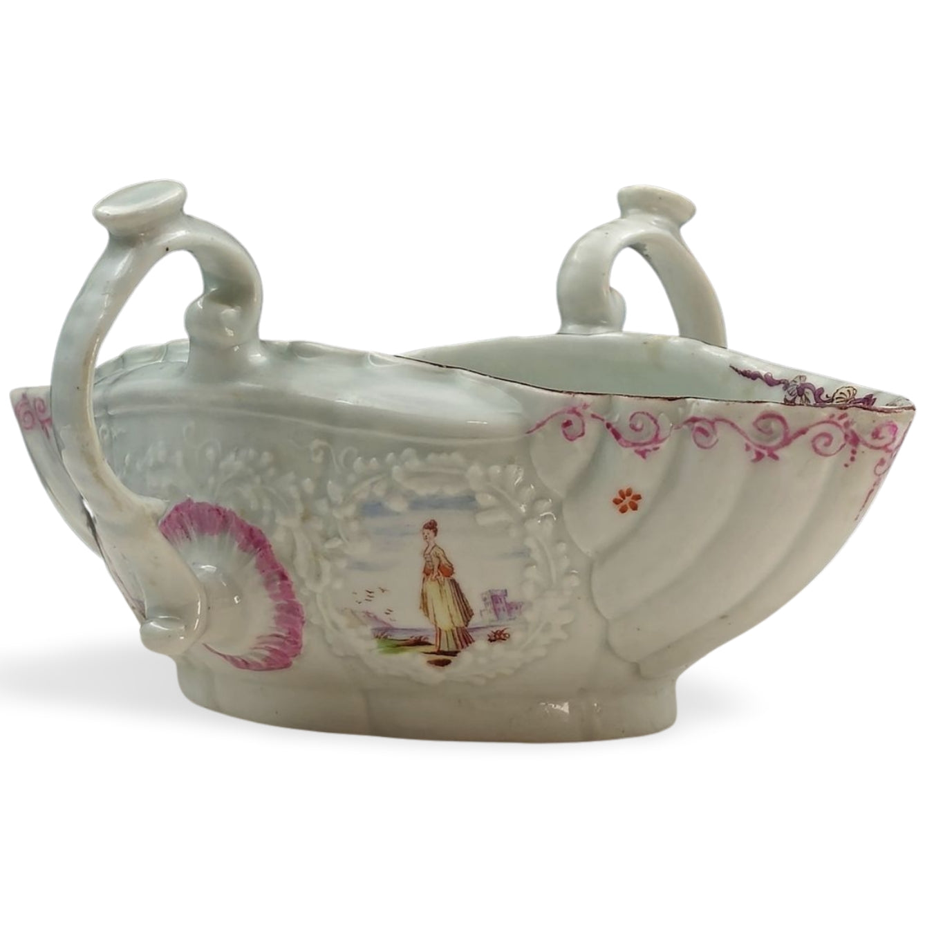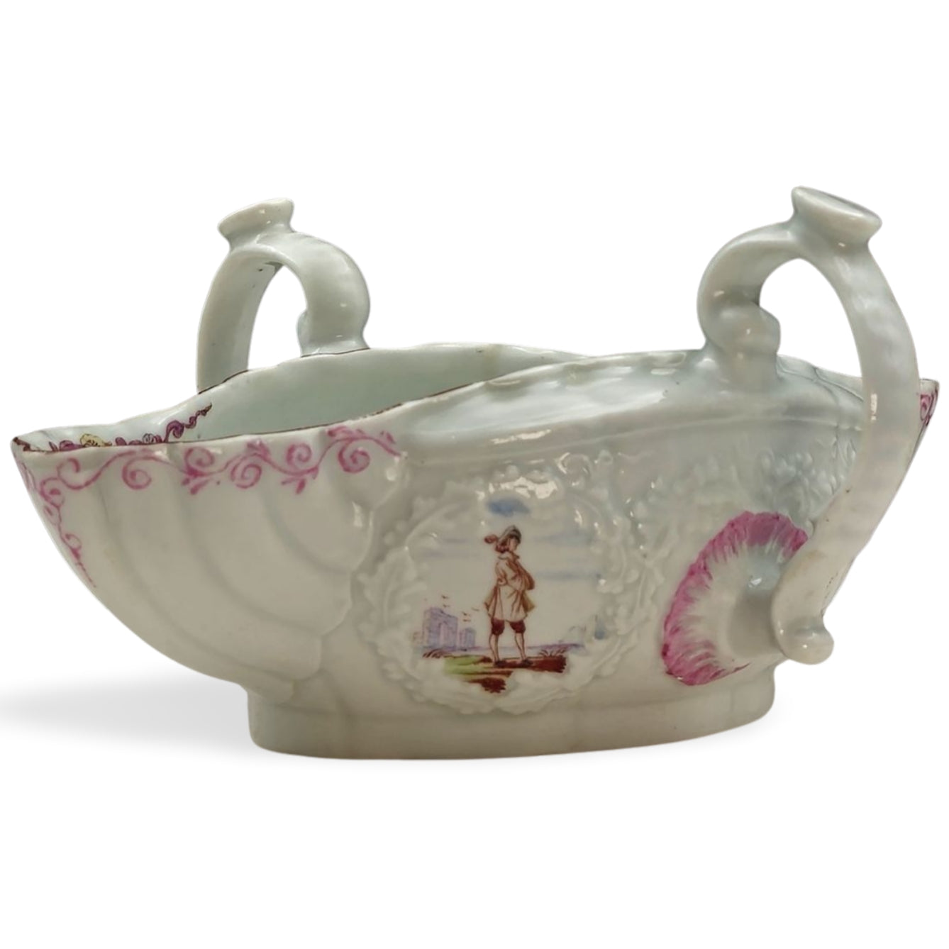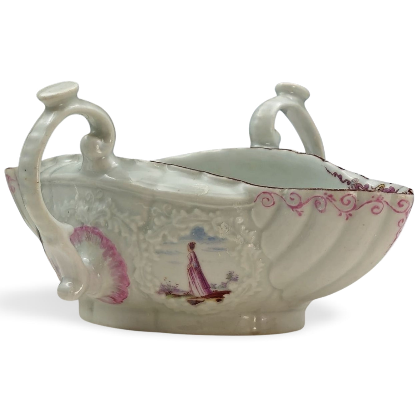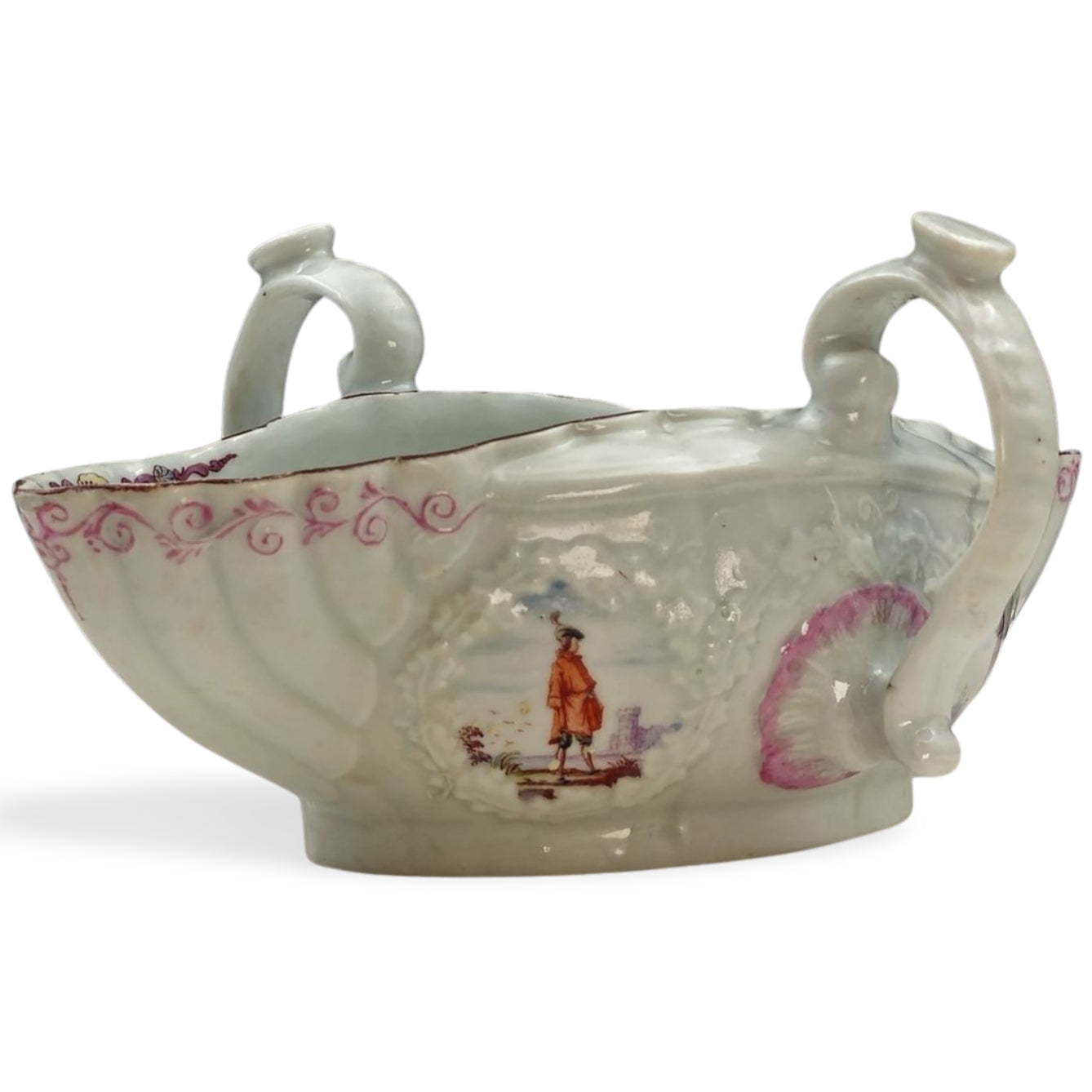 An early two-handled sauceboat, decorated by Jefferyes Hamett O'Neal, probably in the Giles workshop.
