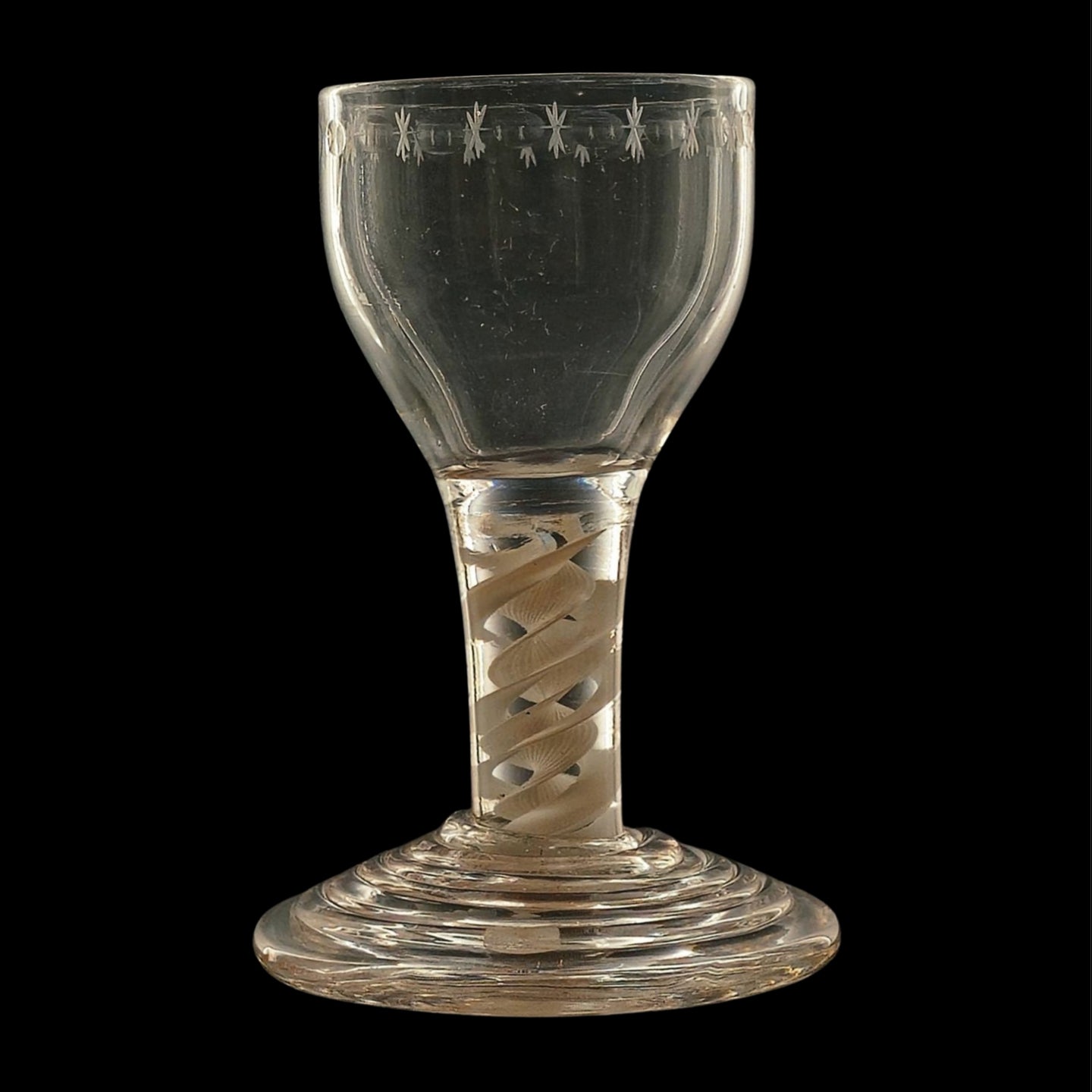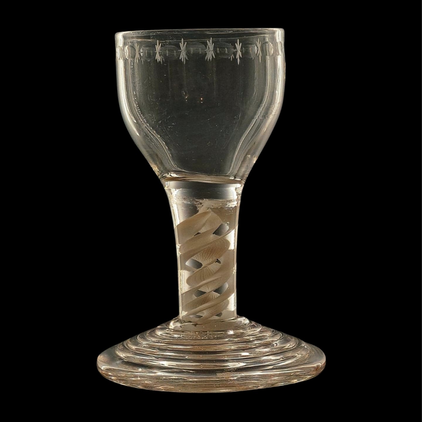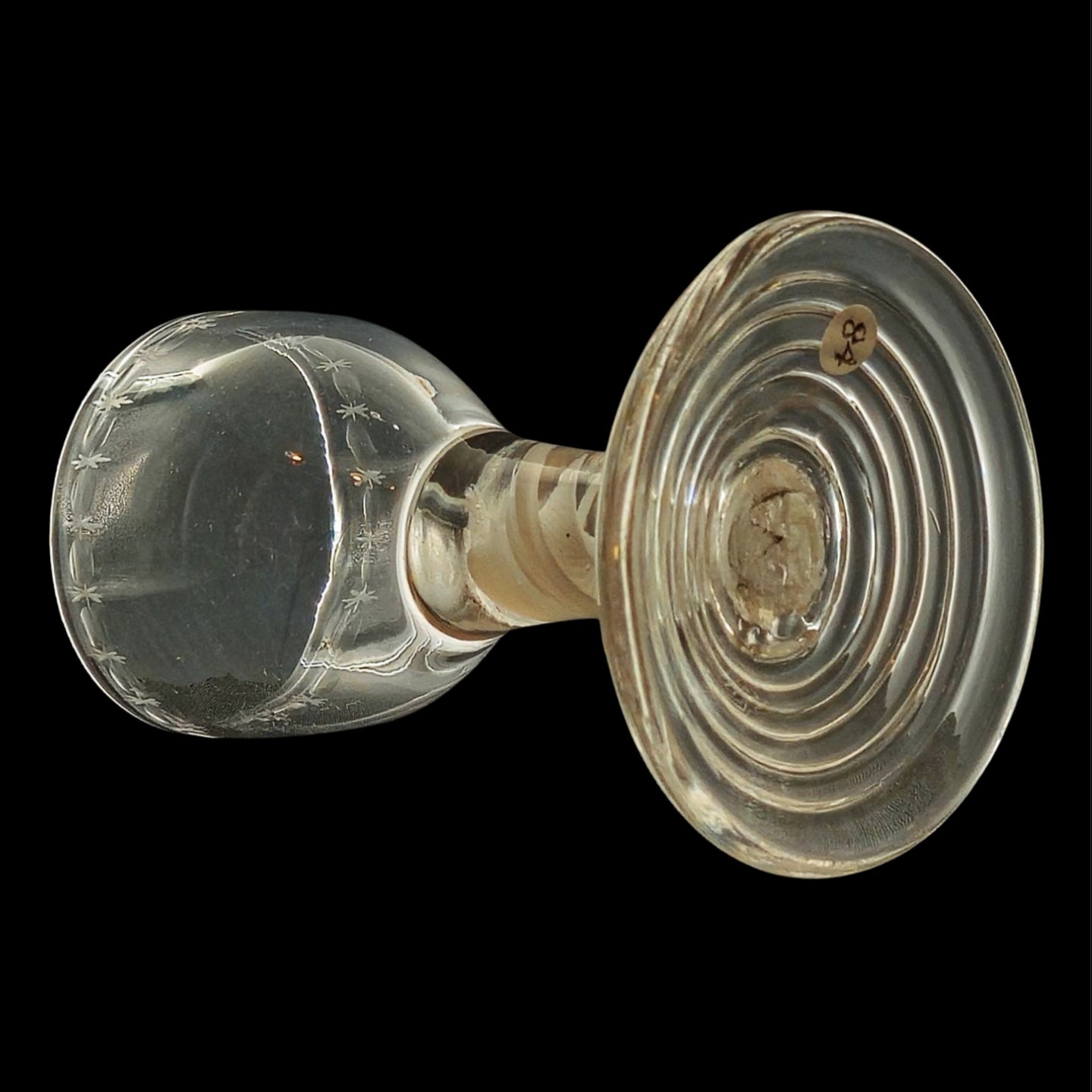 A firing, or toasting, glass with an opaque-twist stem and a stepped foot.