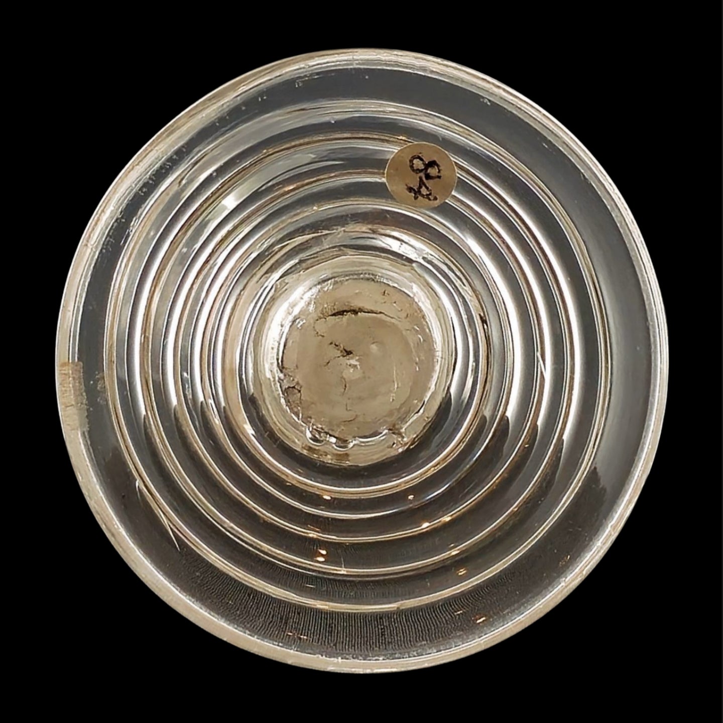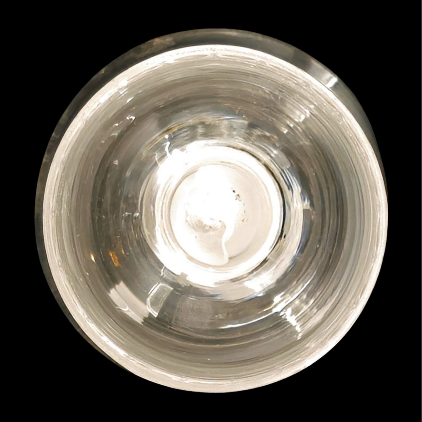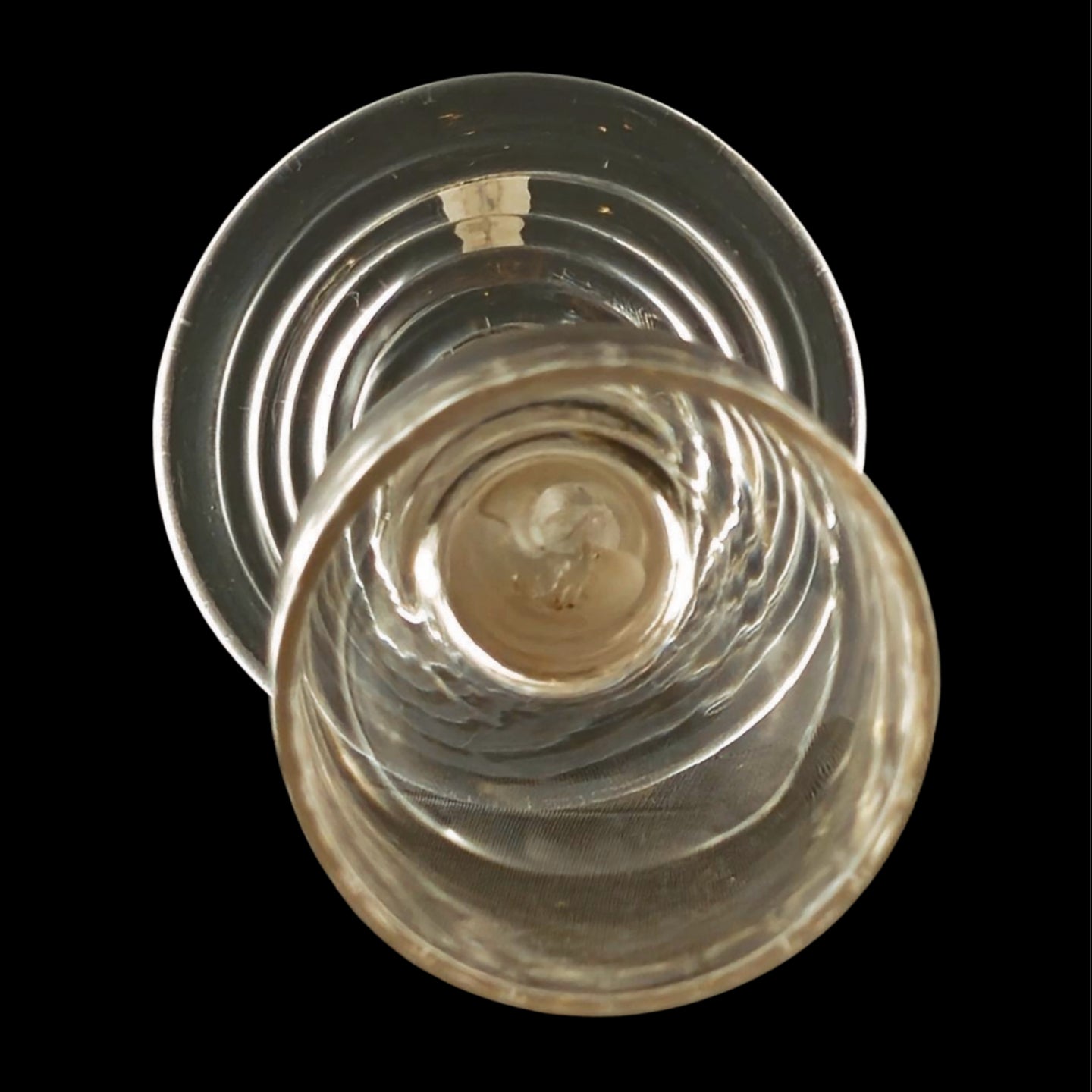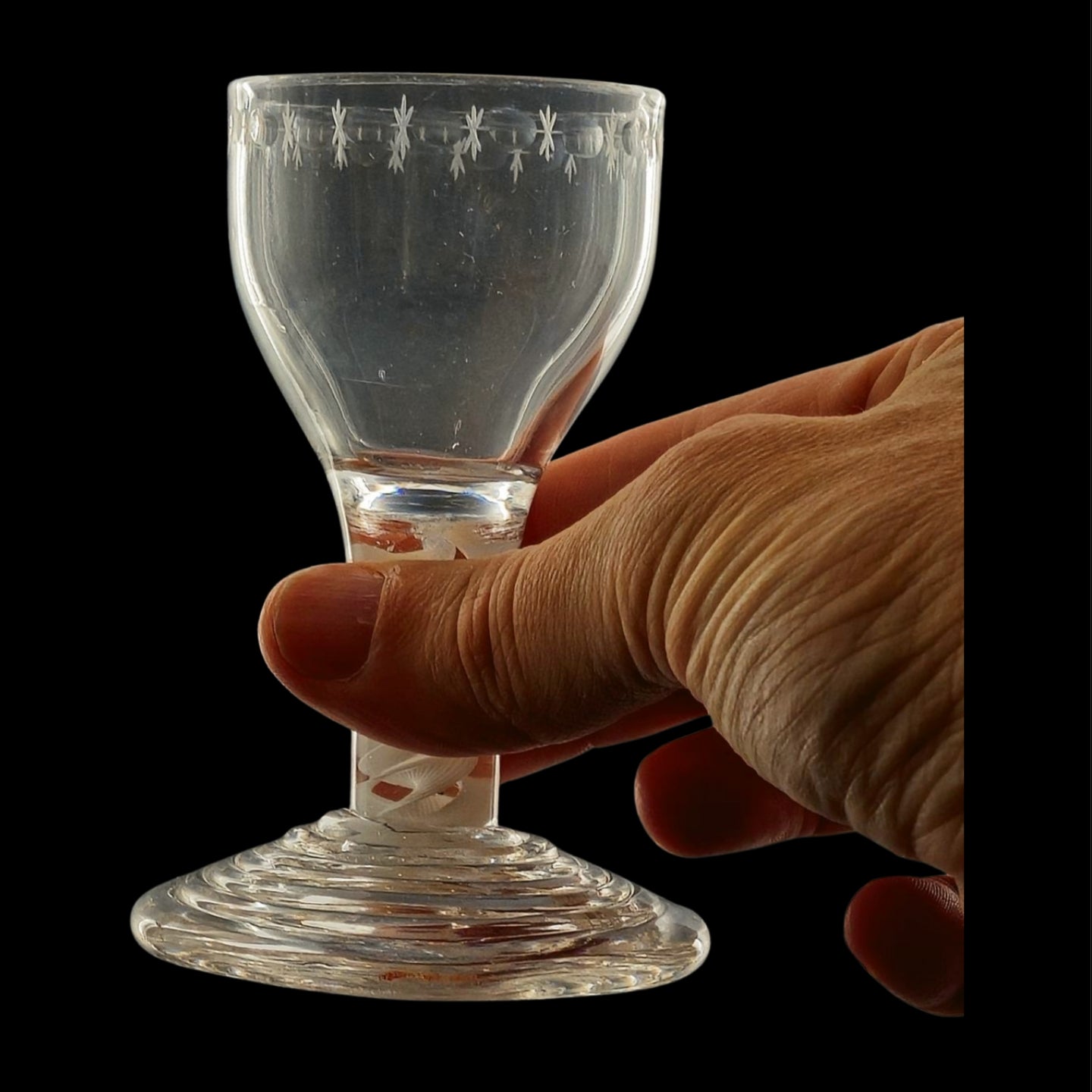 A firing, or toasting, glass with an opaque-twist stem and a stepped foot.