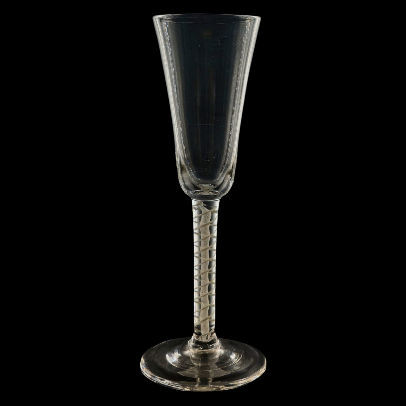 The elongated funnel bowl on a stem with double-opaque twist around a gauze core. A particularly attractive glass.
