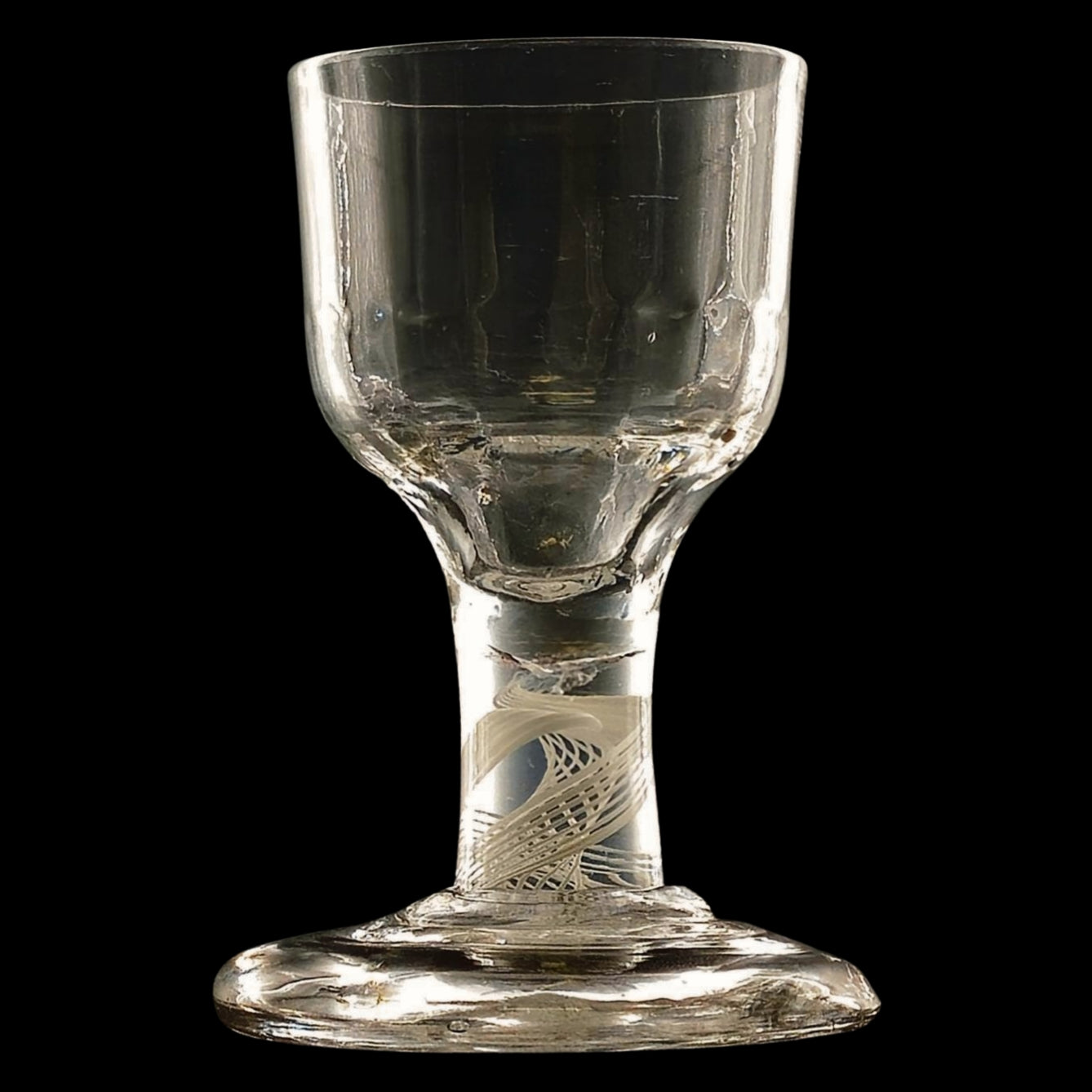 Opaque-twist dram, with moulded decoration and a terraced foot.