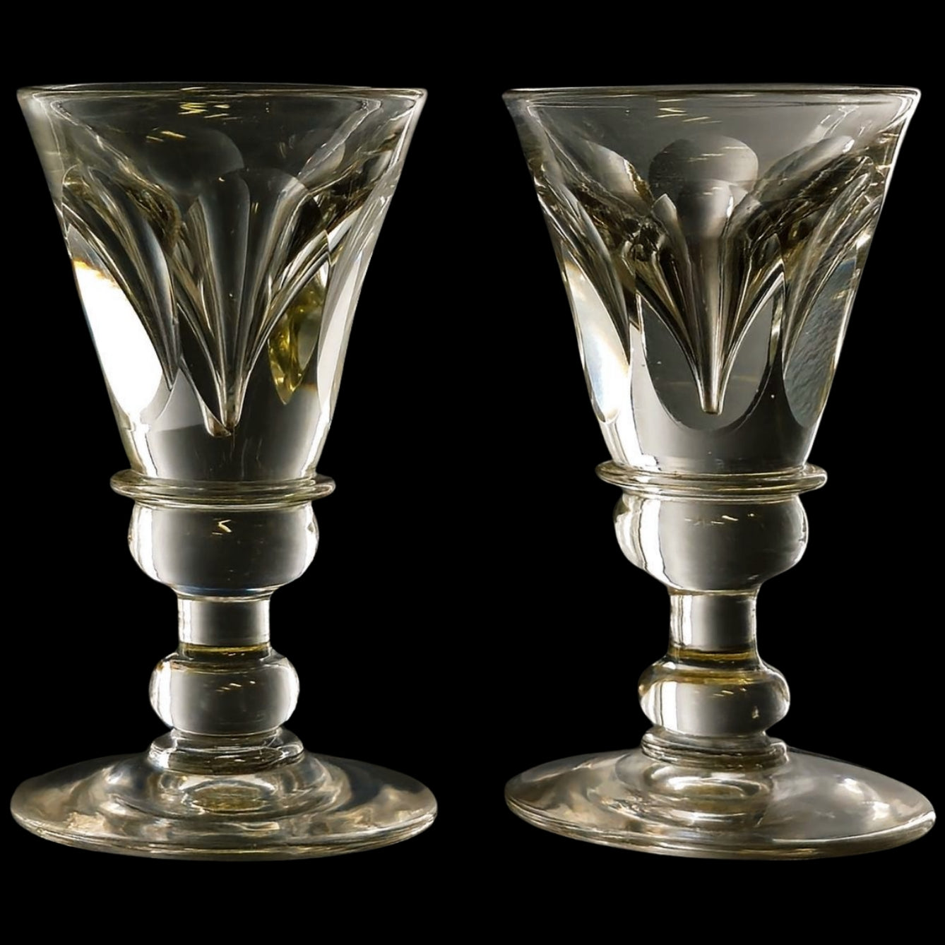 A pair of facetted toasting glasses on elaborate stems.