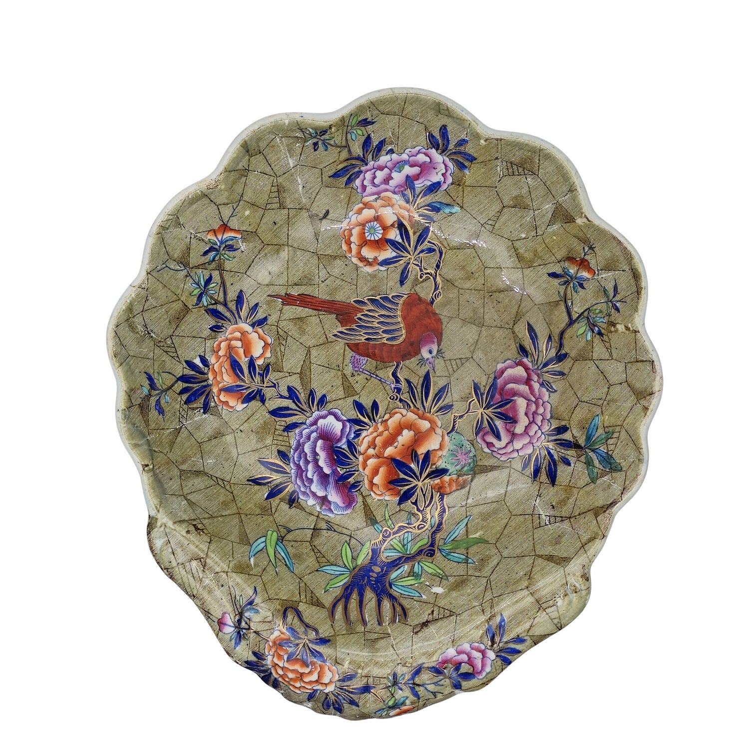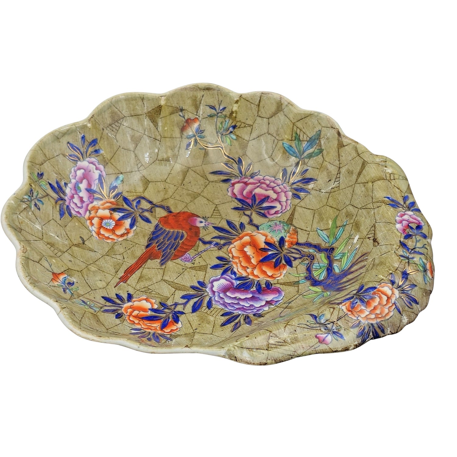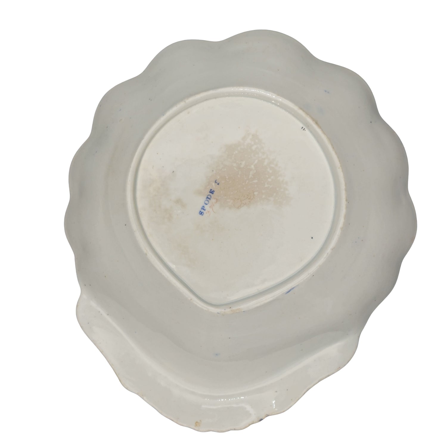 A shell-shaped dish from a dessert set in the Tumbledown Dick pattern, number 3716.