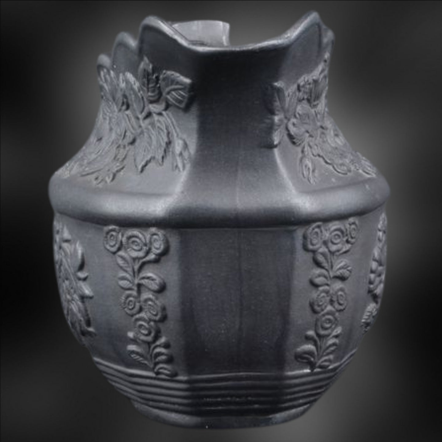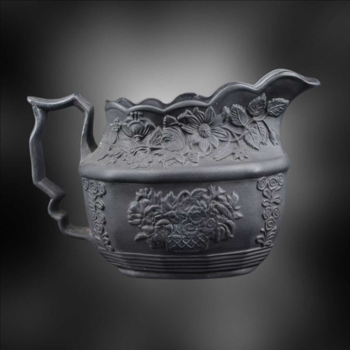 An oblong creamer in black basalt, decorated with flowers and the most fantastic handle.