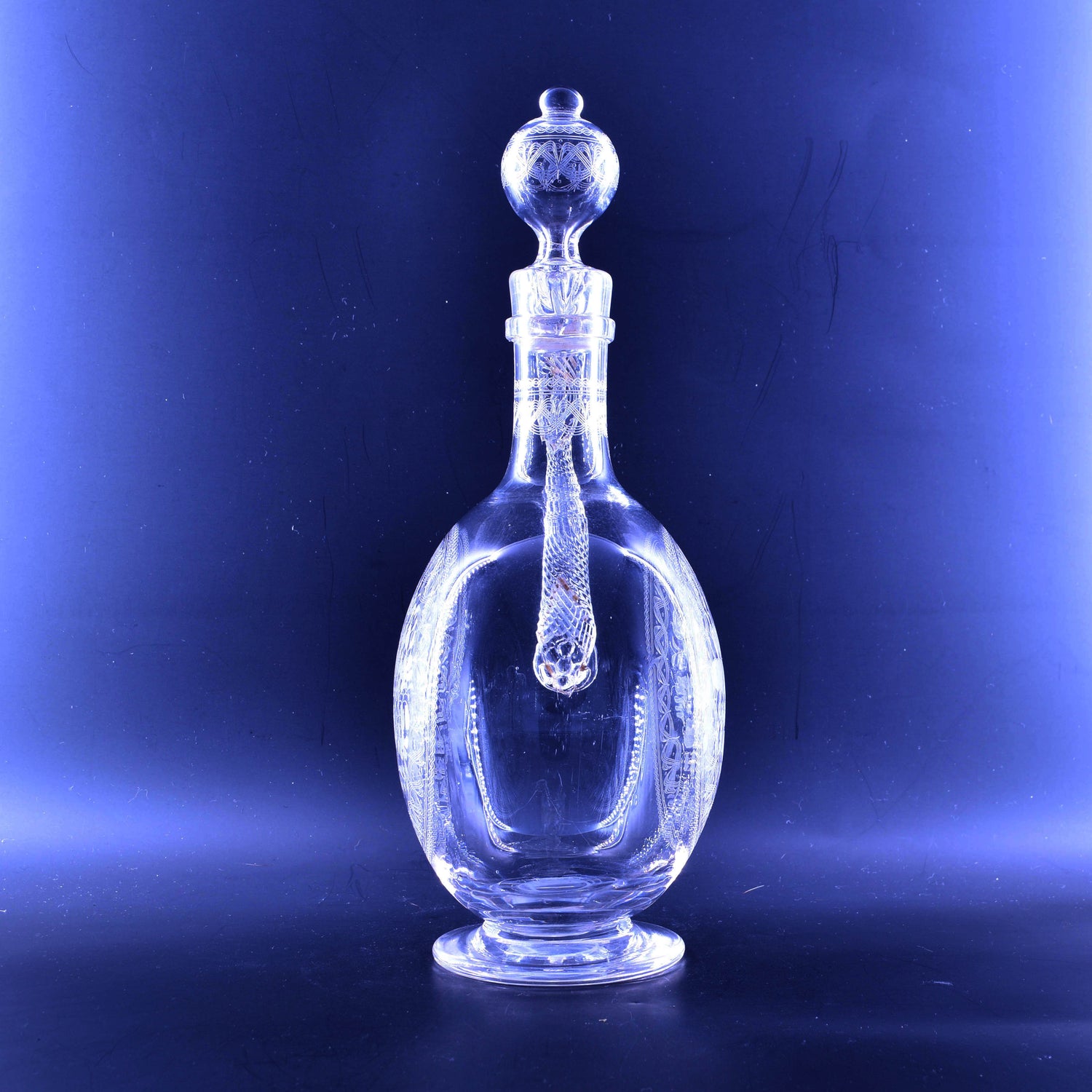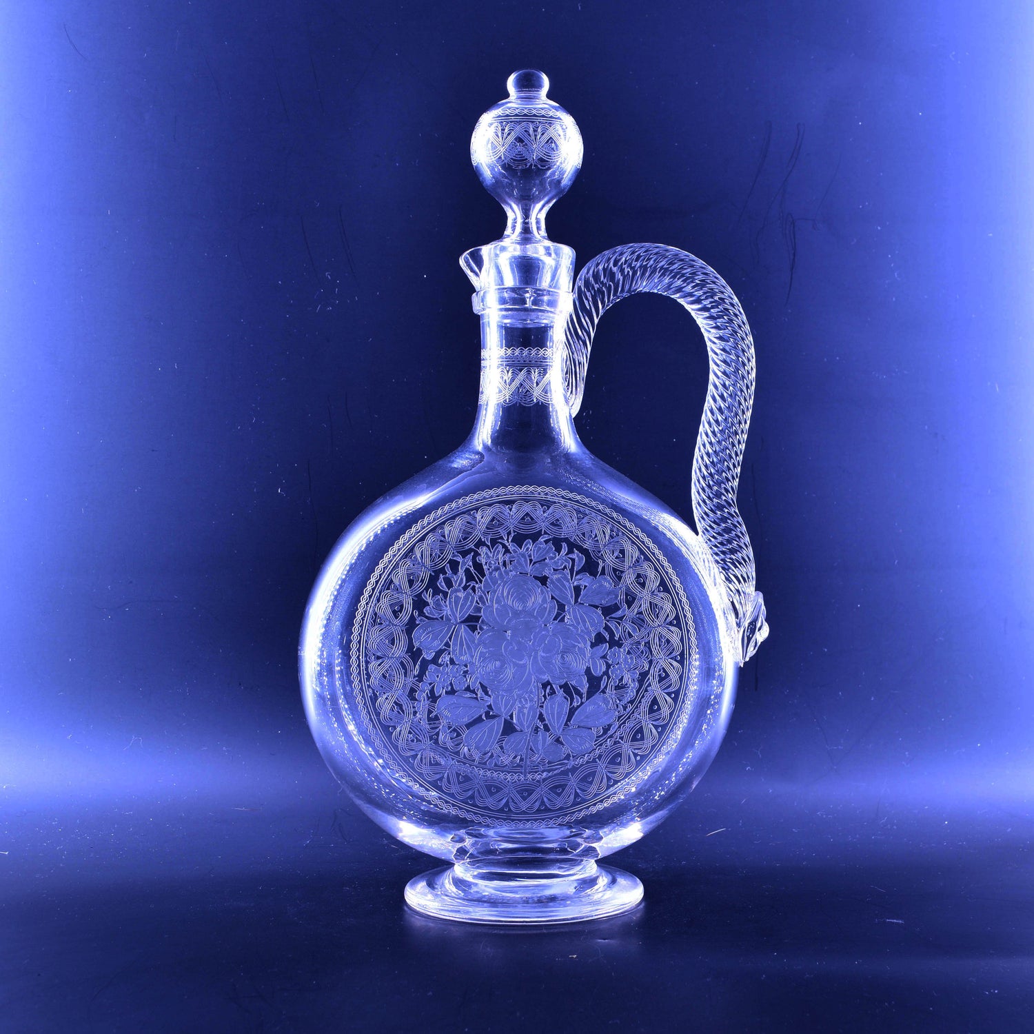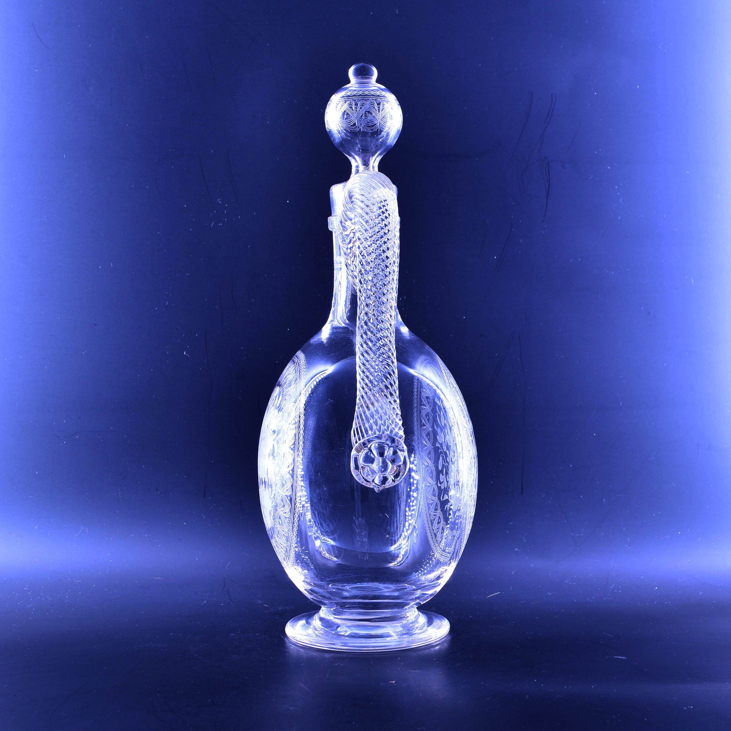 with slender neck, rope twist handle and hollow blown stopper, acid-etched with cartouche panels of flowers and foliage.