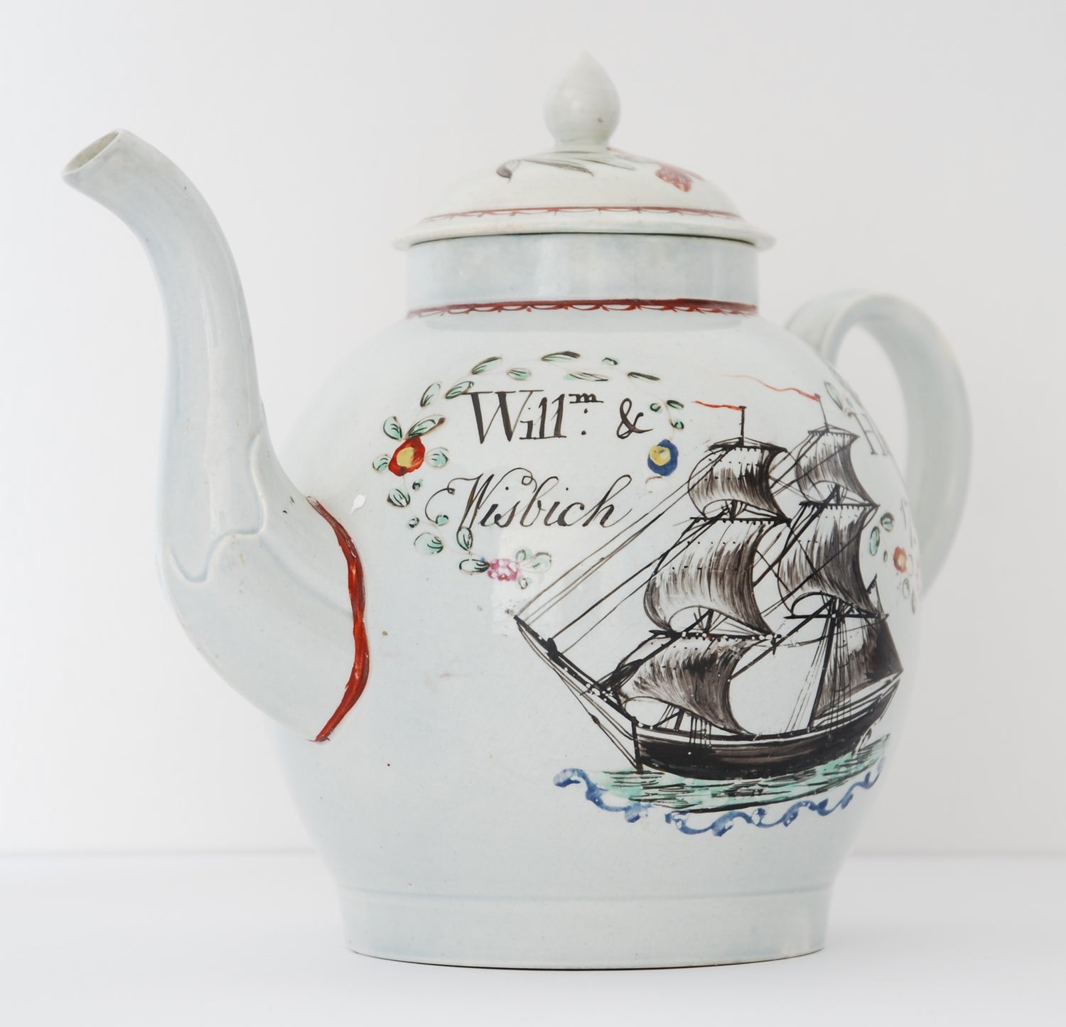 A fine documentary teapot, probably made to record a marriage between a sailor and his lass - William & Hannah WISBICH. Pearlware, enamelled with a square-rigged schooner.