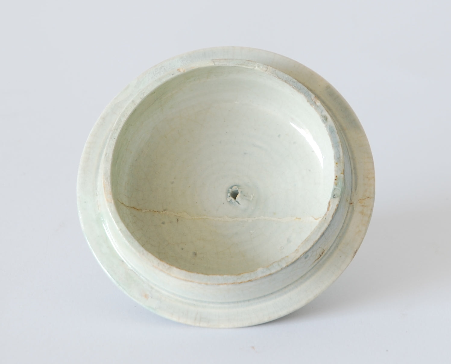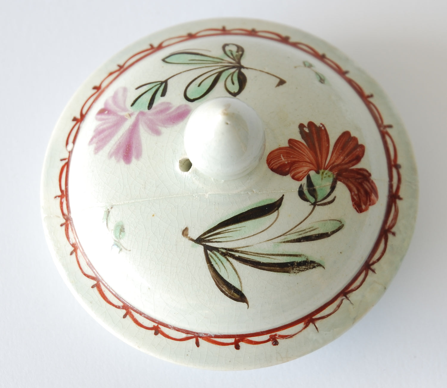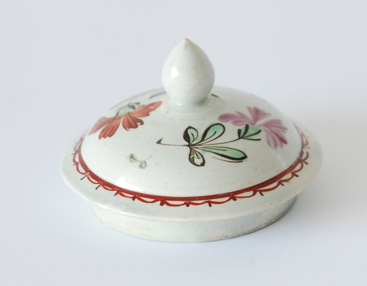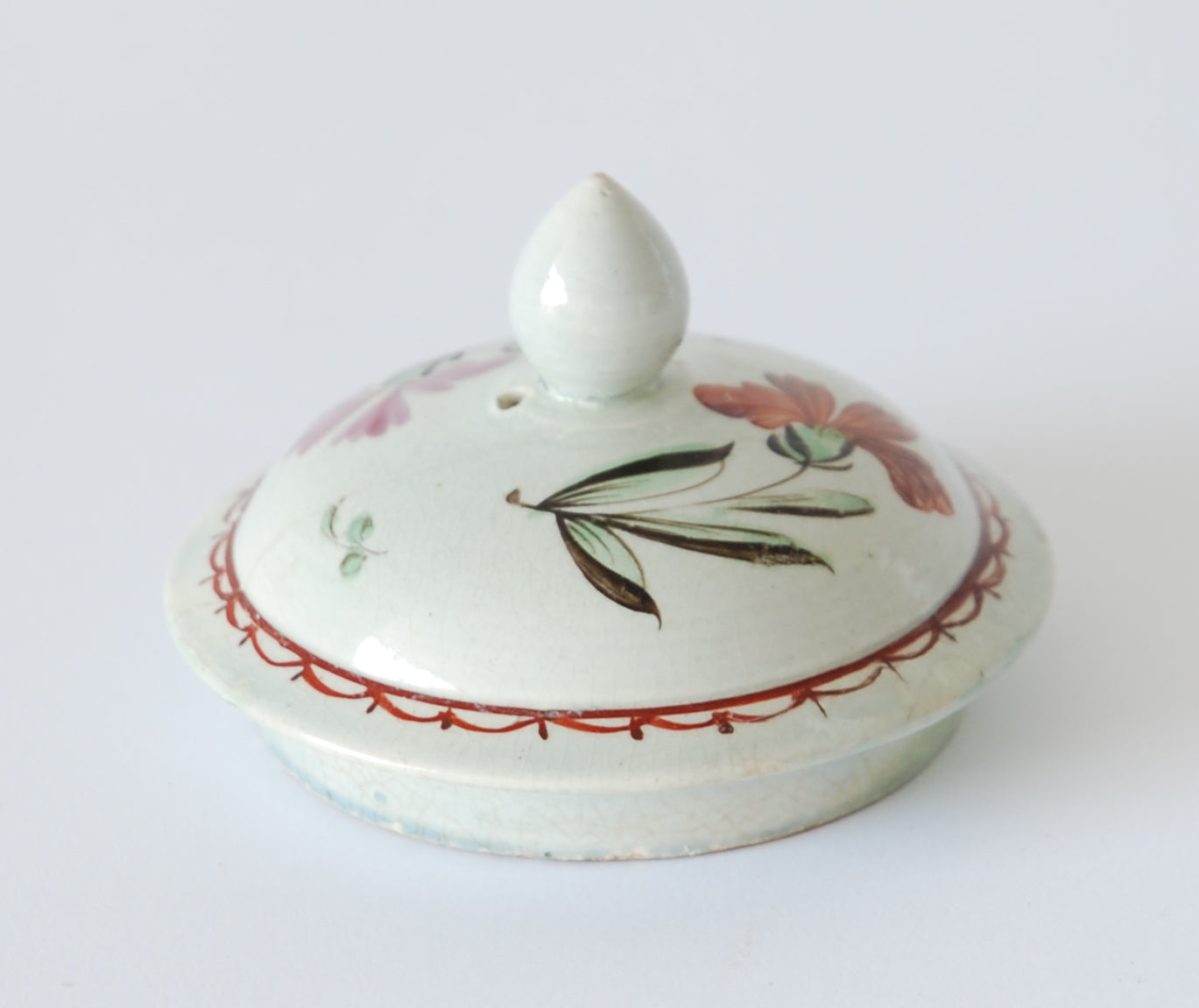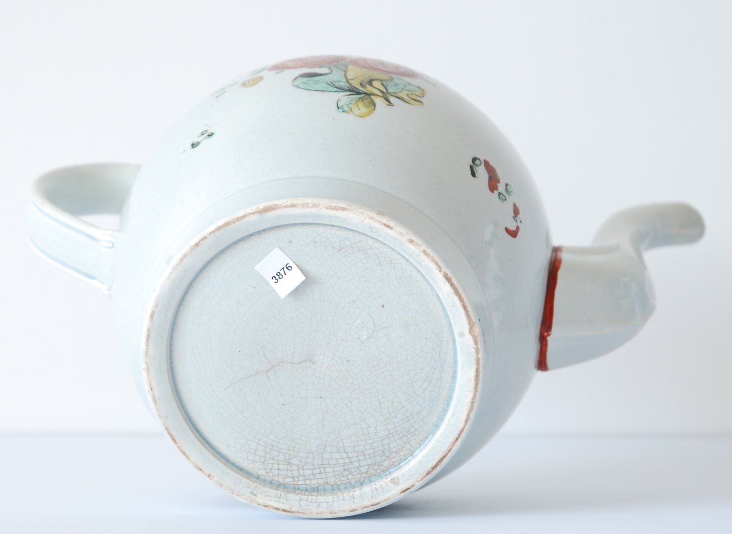 Repairs: Museum restorations to the tip of the spout and tiny hair lines to the rim and some chips. The lid has been broken in two and fixed, there are associated chips to the under side of the lid.
