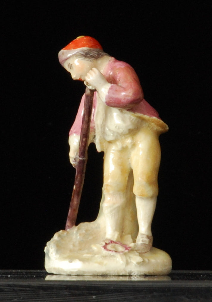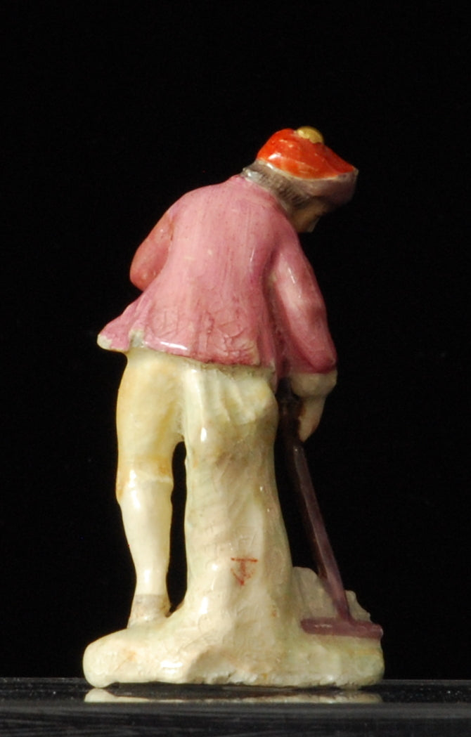 A rare, red-anchor period miniature figure of a Gardener with his rake.