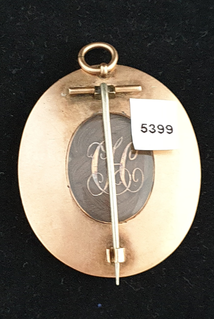 Miniature Portrait set in rose gold as a Brooch or pendant. A window to the back contains braided hair, no doubt of the sitter, overlaid with a gilt monogram.