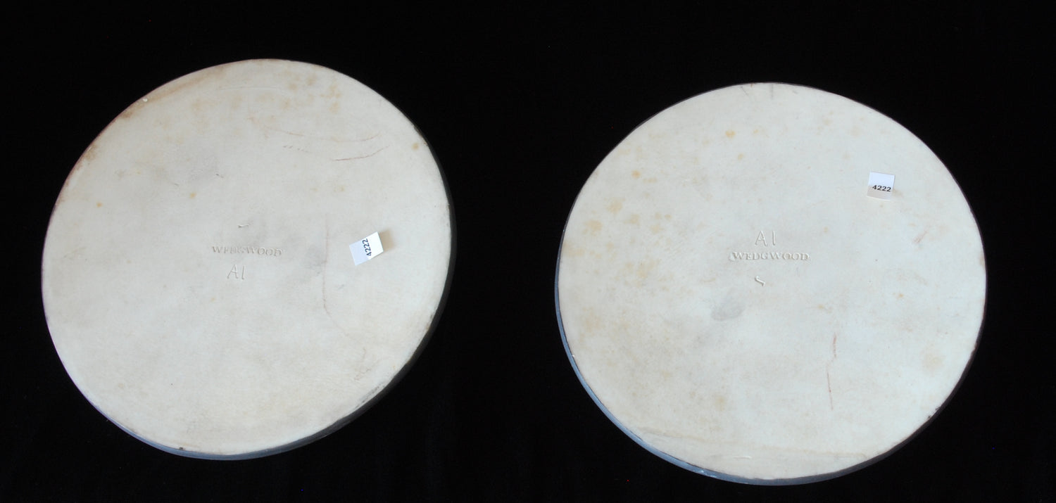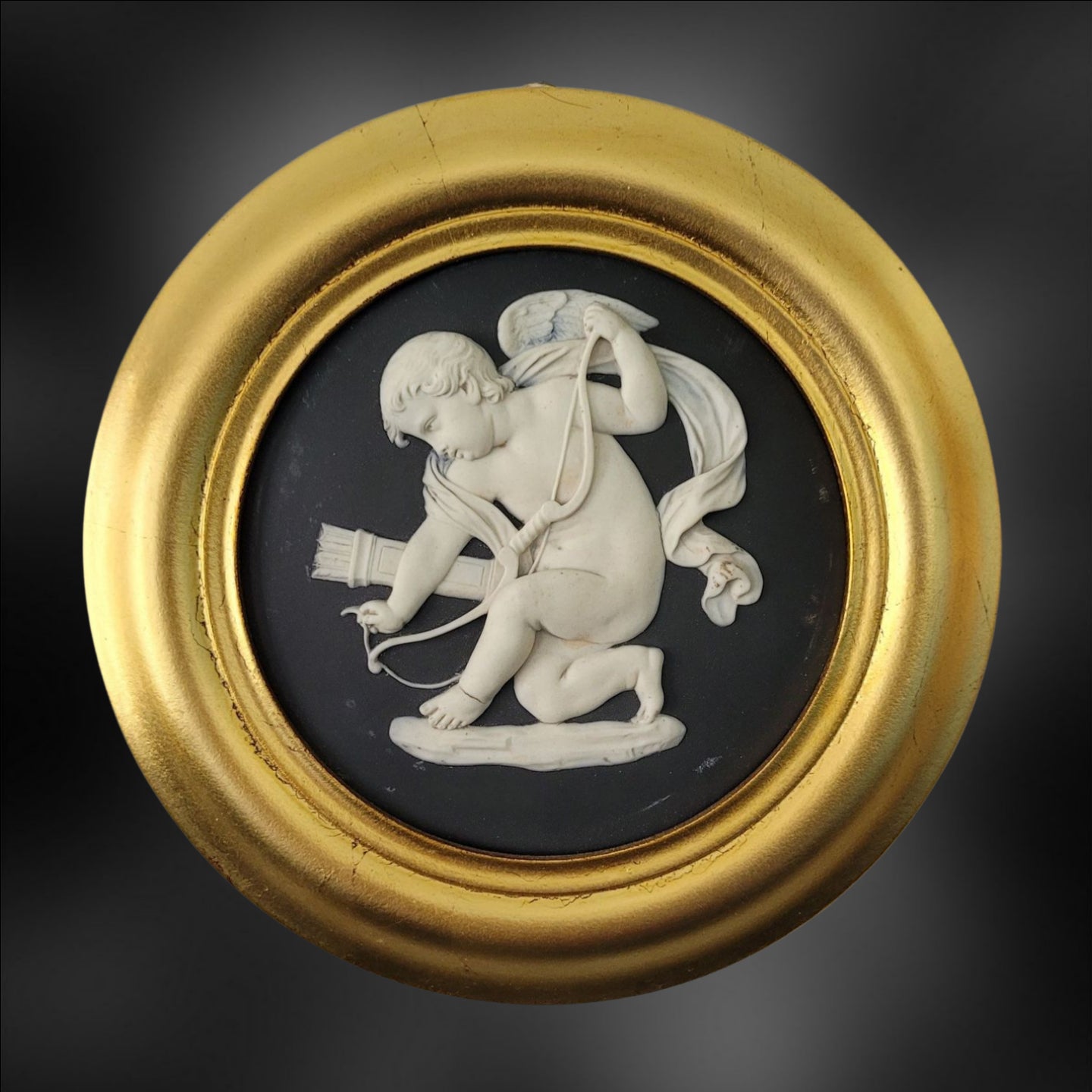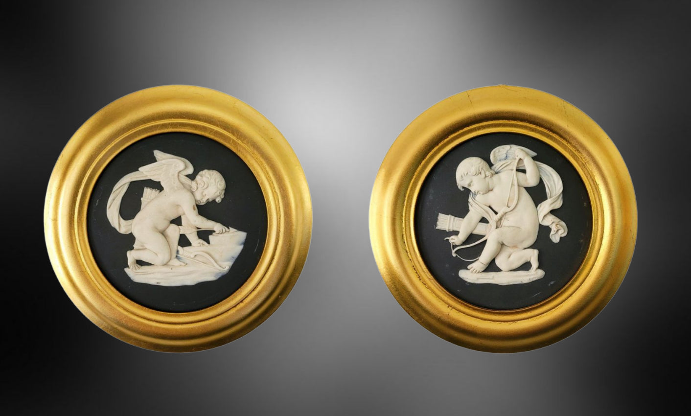 Pair of roundels in black jasper, showing Cupid Sharpening his arrows and Cupid Stringing his bow.