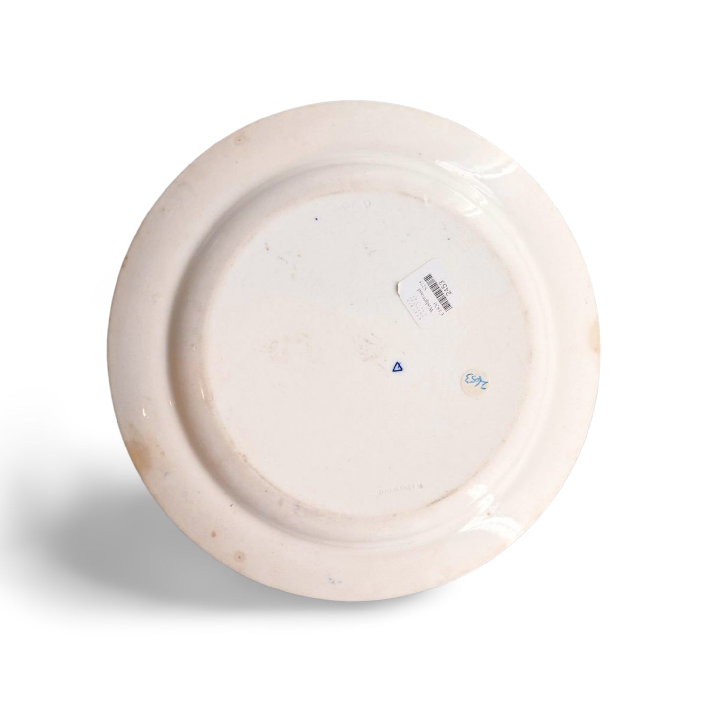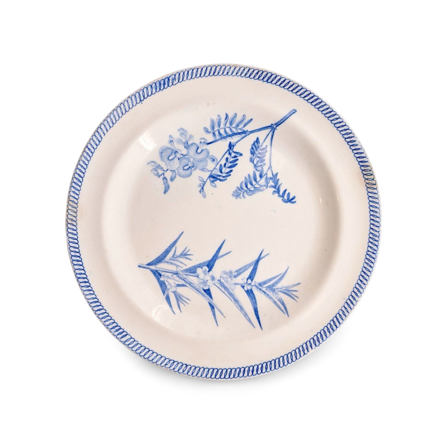 Botanical plate with a circle border. This border was used ont he very first of the underglaze blue transfer wares produced by Wedgwood.