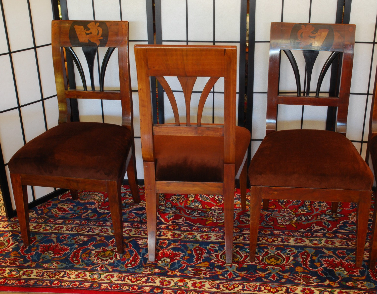 Set of four chairs in fruitwood and walnut, with ebonised details.