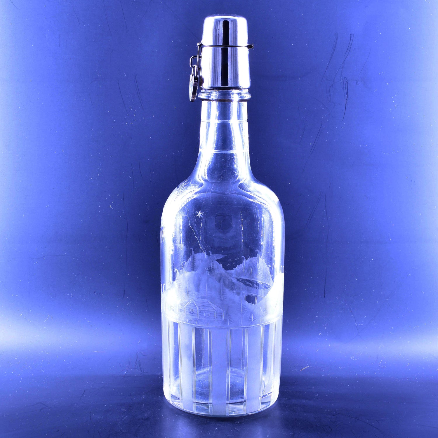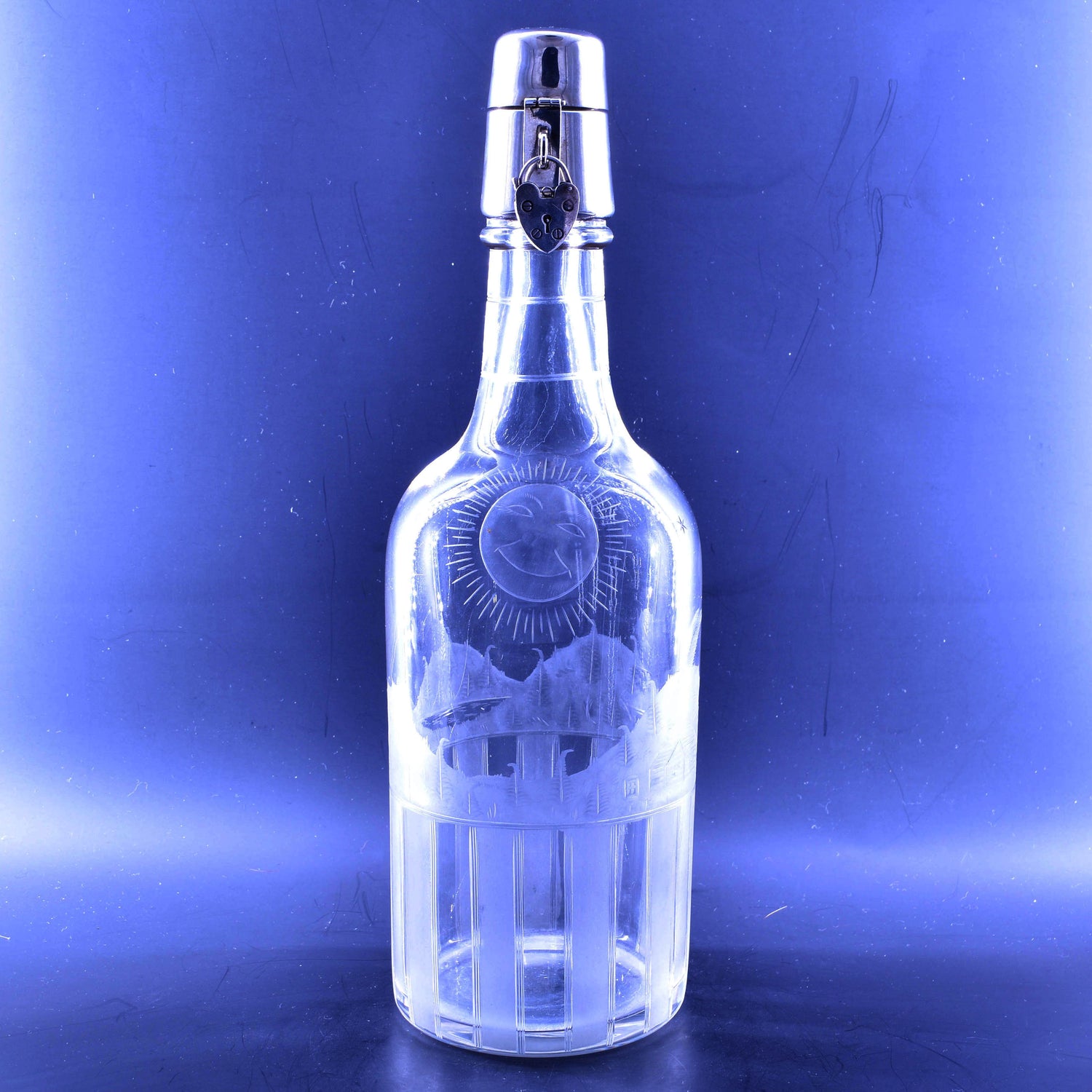 Tantalus decanter, made in the shape of a bottle, with engraving and silver lock. The lock is a pretend lock. but looks quite convincing. It is easily opened and has no key.