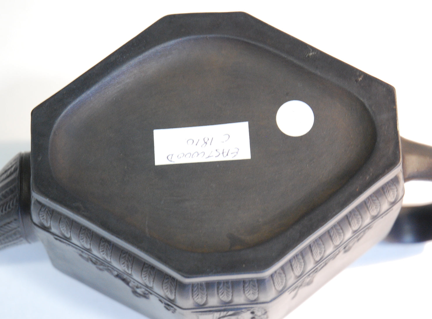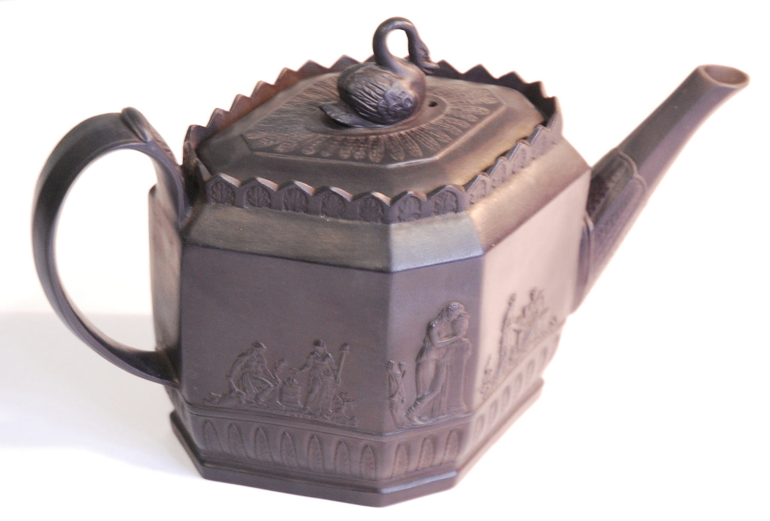 Very fine teapot in polished black basalt in an unusual diamond shape and well modelled sprigging. See Berthoud 2nd edition plate 898 for a similar teapot.